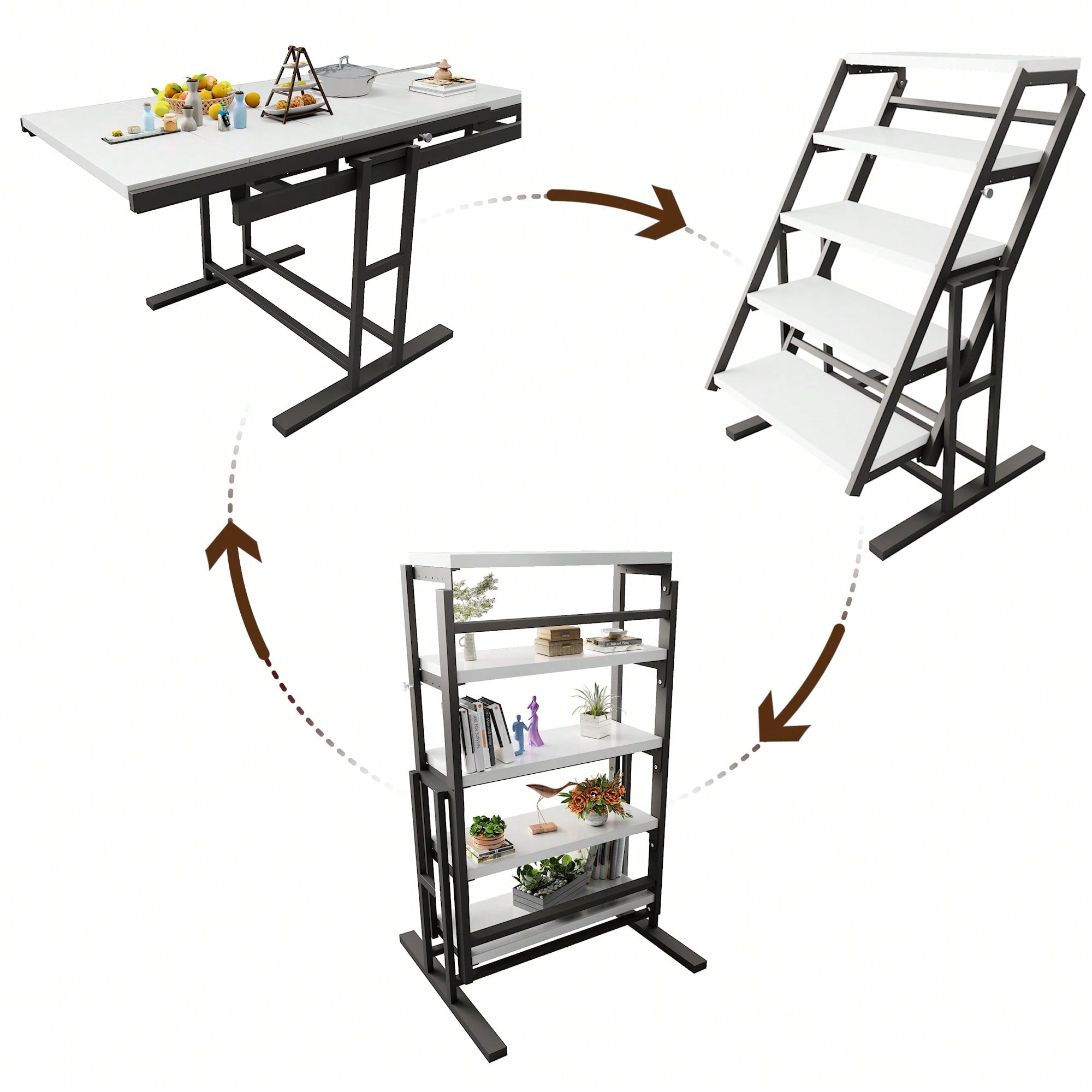 Elegant Solid Mahogany Multifunction Convertible Dining Table With Space-Saving Shelf, Ideal For Home And Studio - White Finish