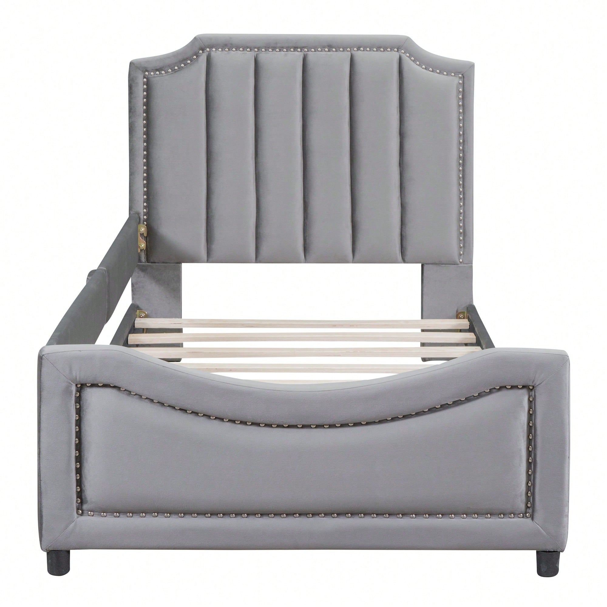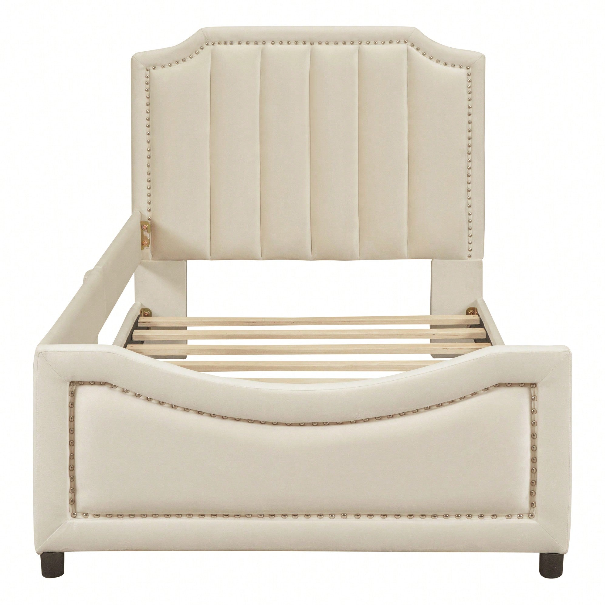 Elegant Beige Twin Size Upholstered Daybed With Classic Striped Headboard – Versatile And Stylish Sleeping Solution For Any Room