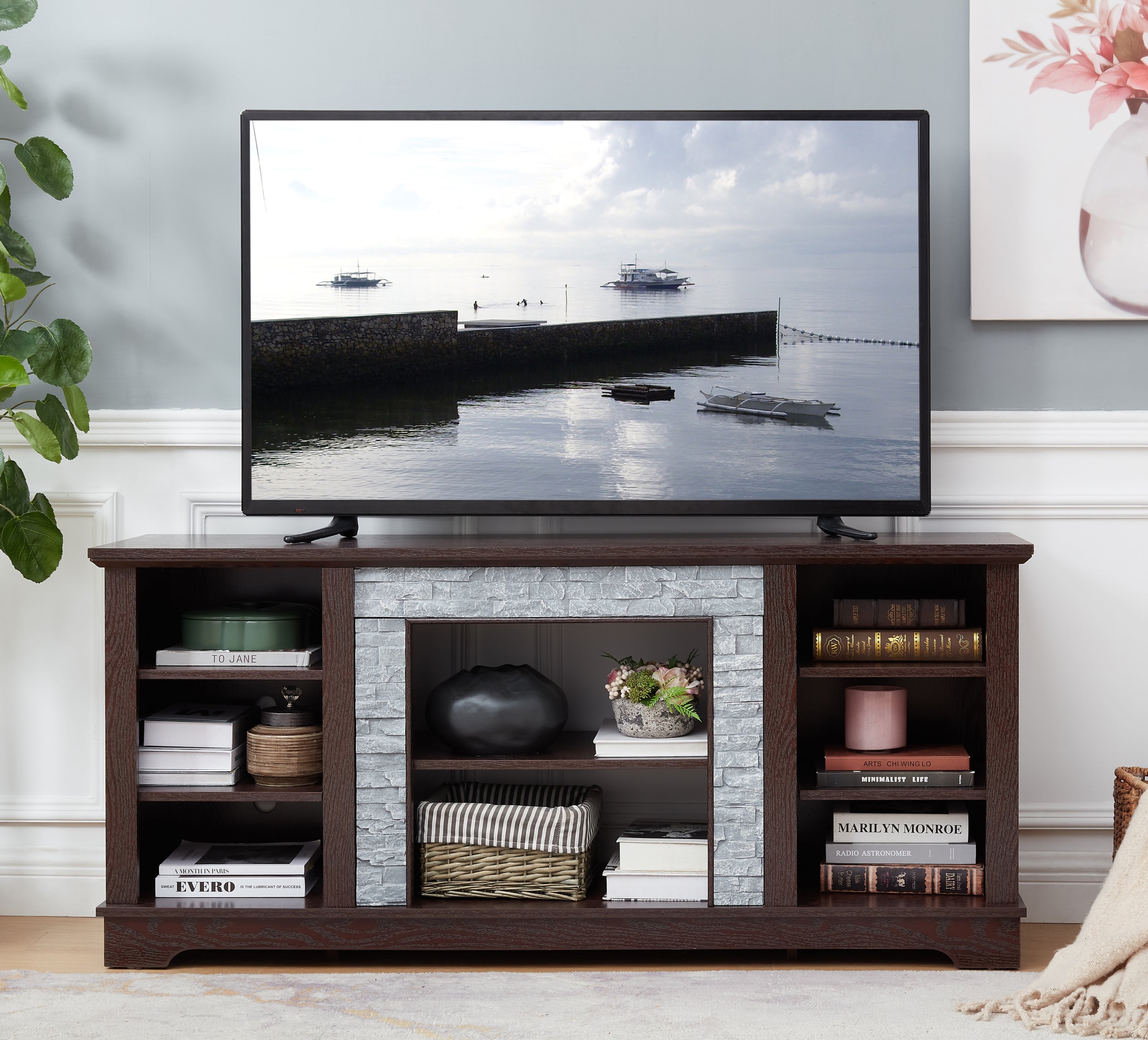 TV Media Stand with with Faux Stacked Stone Surround, Modern Entertainment Console with Open Storage Space, Cherry, 58.31"W*15.39"D*26.06"H