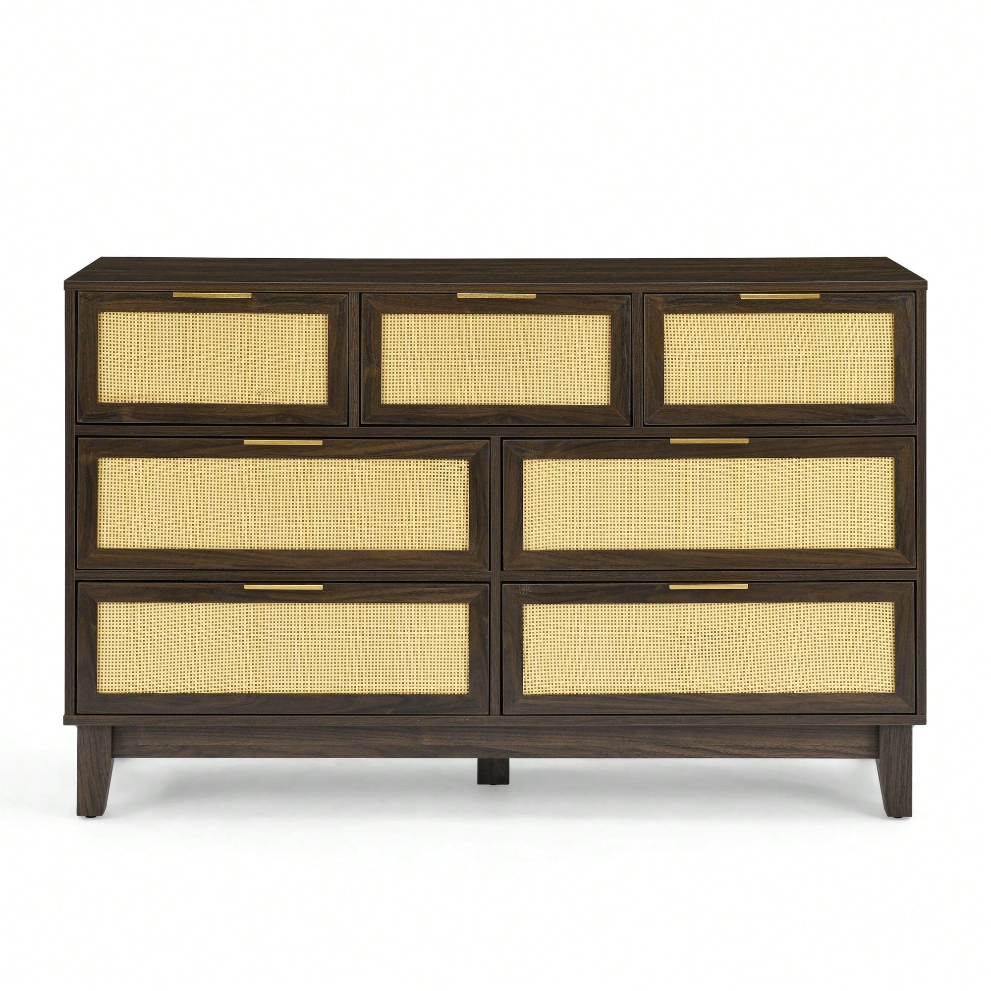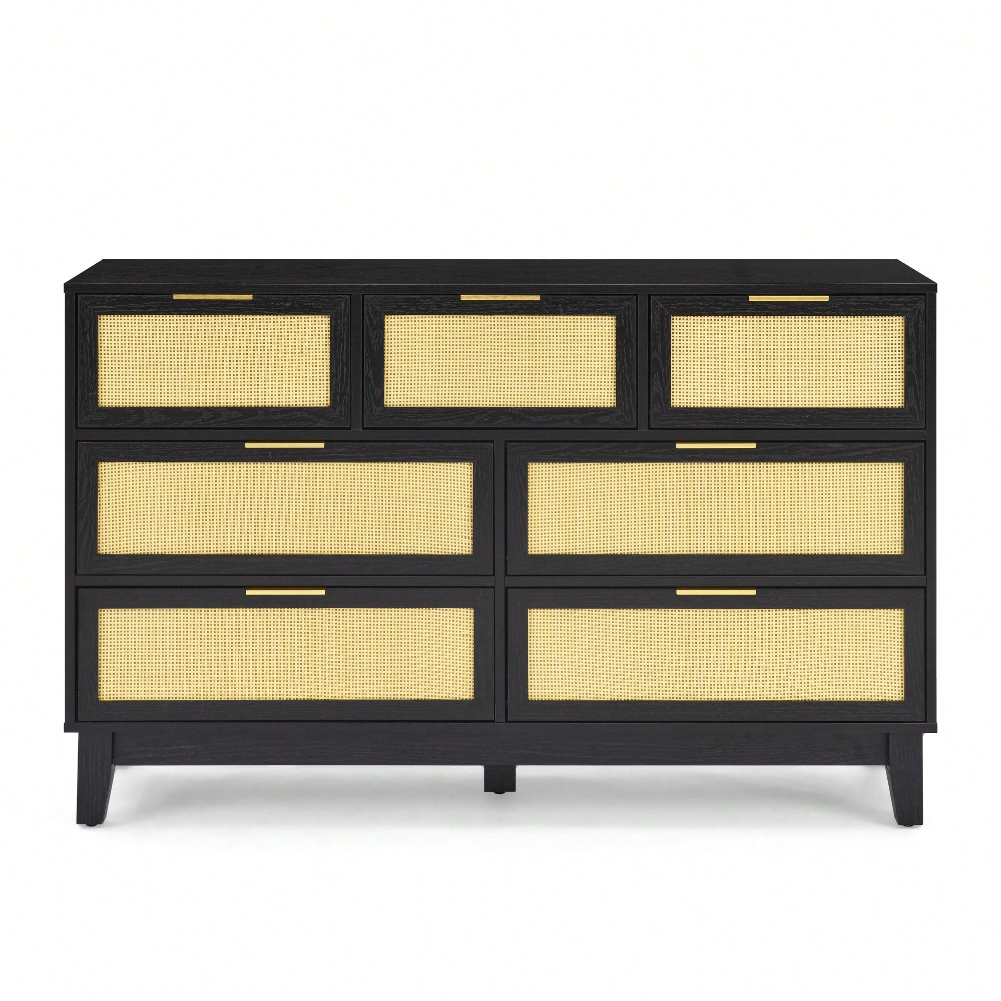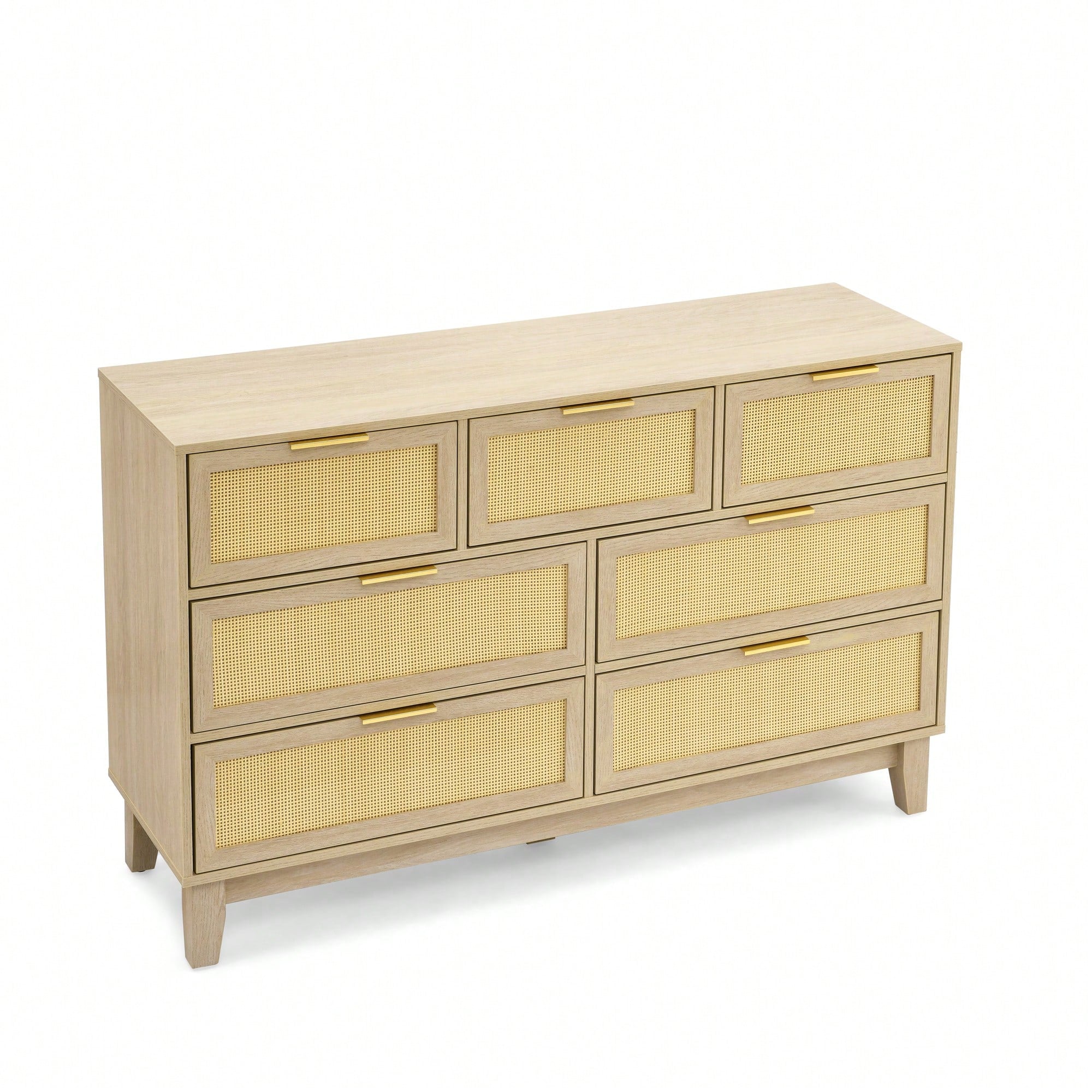 Modern 7-Drawer Rattan Dresser - Stylish Wooden Chest For Spacious Bedroom, Hallway, Or Living Room Storage