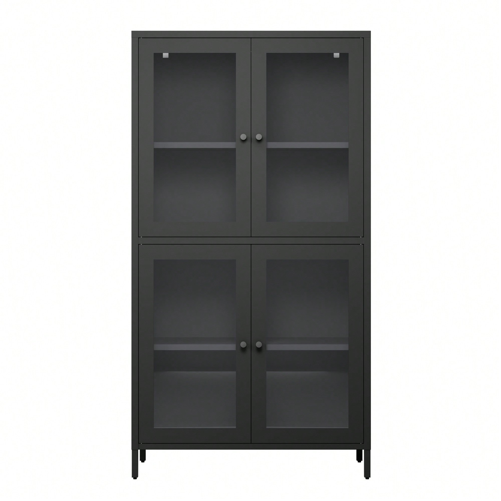 Elegant Black Metal Display Cabinet With 4 Glass Doors And Shelves For Home, Office, Or Living Spaces - Tempered Glass Design