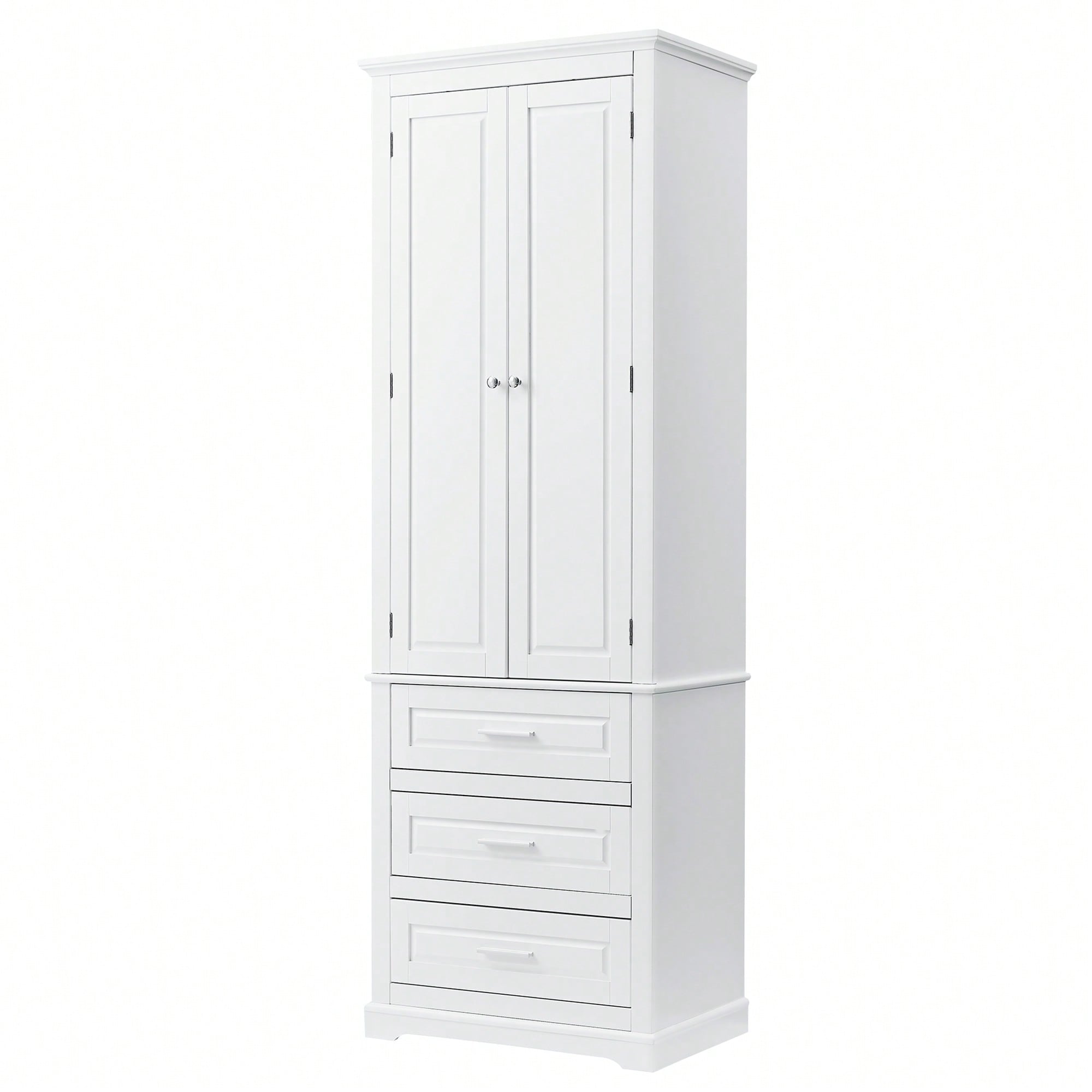 Tall White Storage Cabinet With Adjustable Shelves And Three Drawers For Bathroom Office Organization