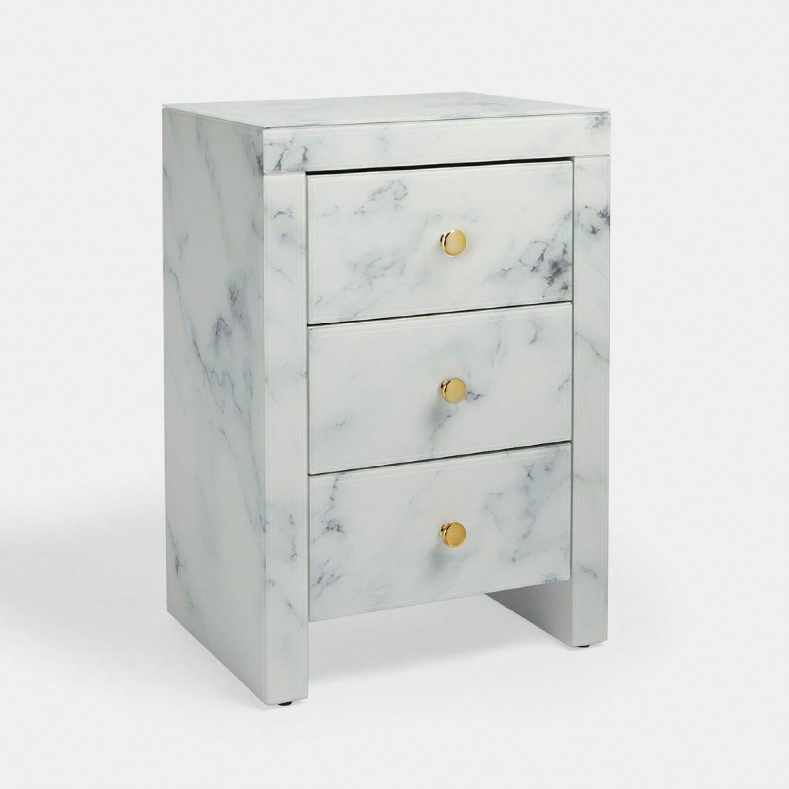 Elegant Marble Pattern Nightstand with 3 Drawers and Tempered Glass Top for Bedroom and Living Room Storage