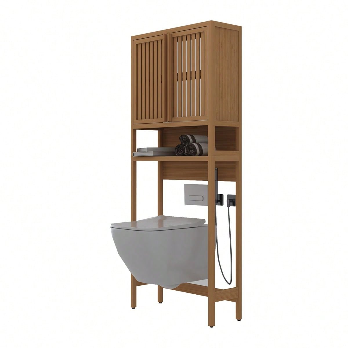 Extra Large Capacity Toilet Storage Rack, Making Full Use Of Bathroom Space, Bamboo Toilet Storage Rack, Open Shelf And Two Louvered Doors.