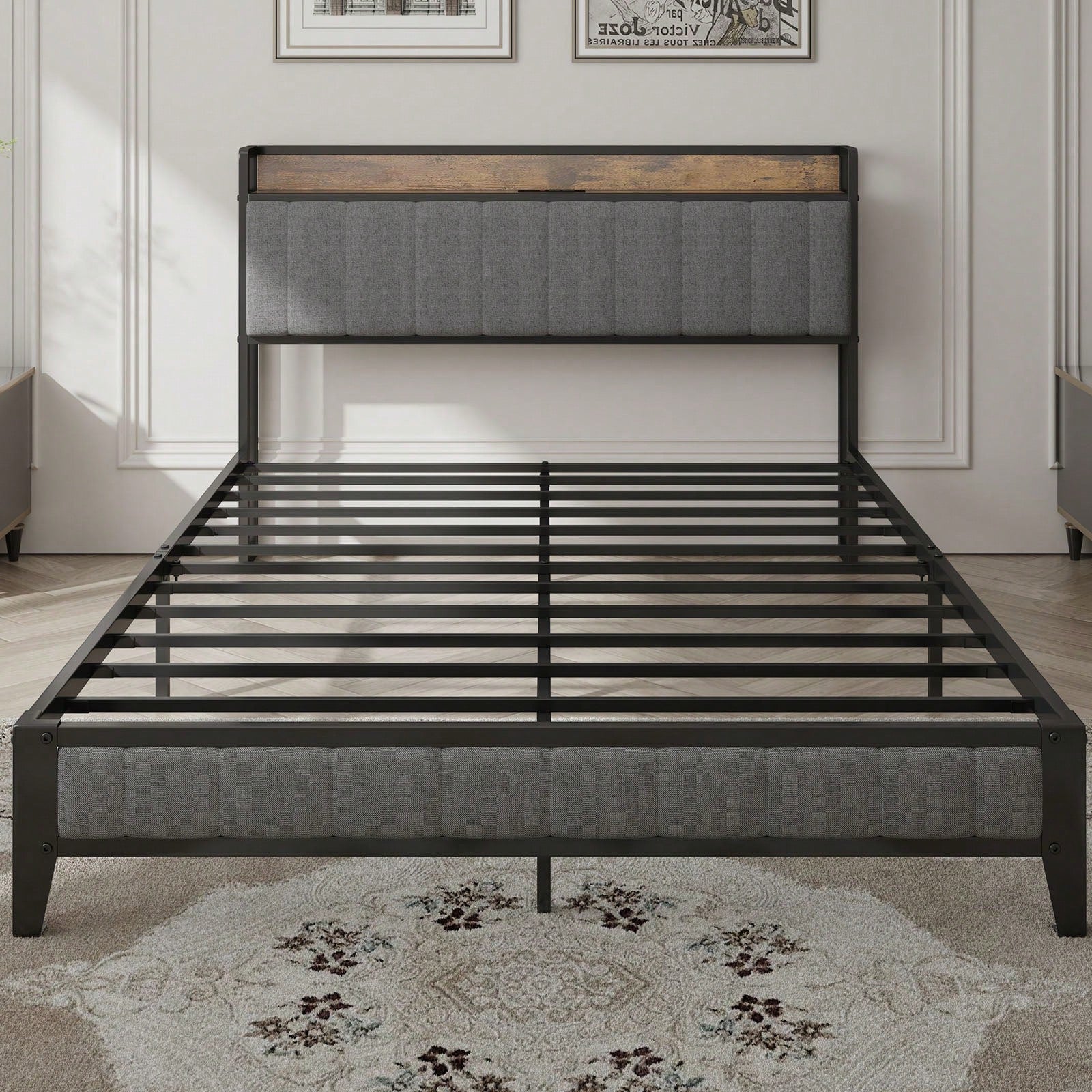 Grey Queen Bed Frame with USB Charging Station Upholstered Headboard Metal Platform No Box Spring Needed Vintage Design
