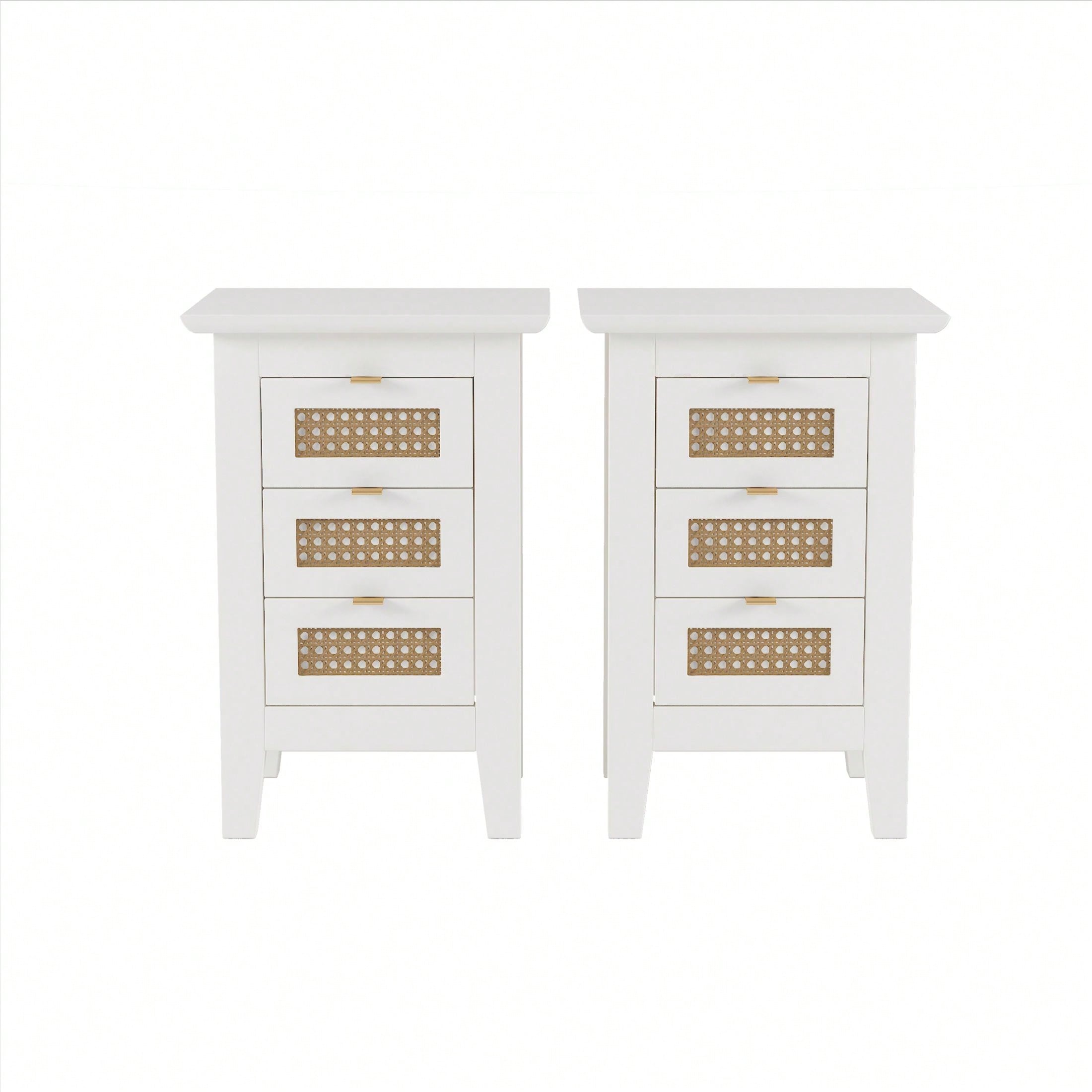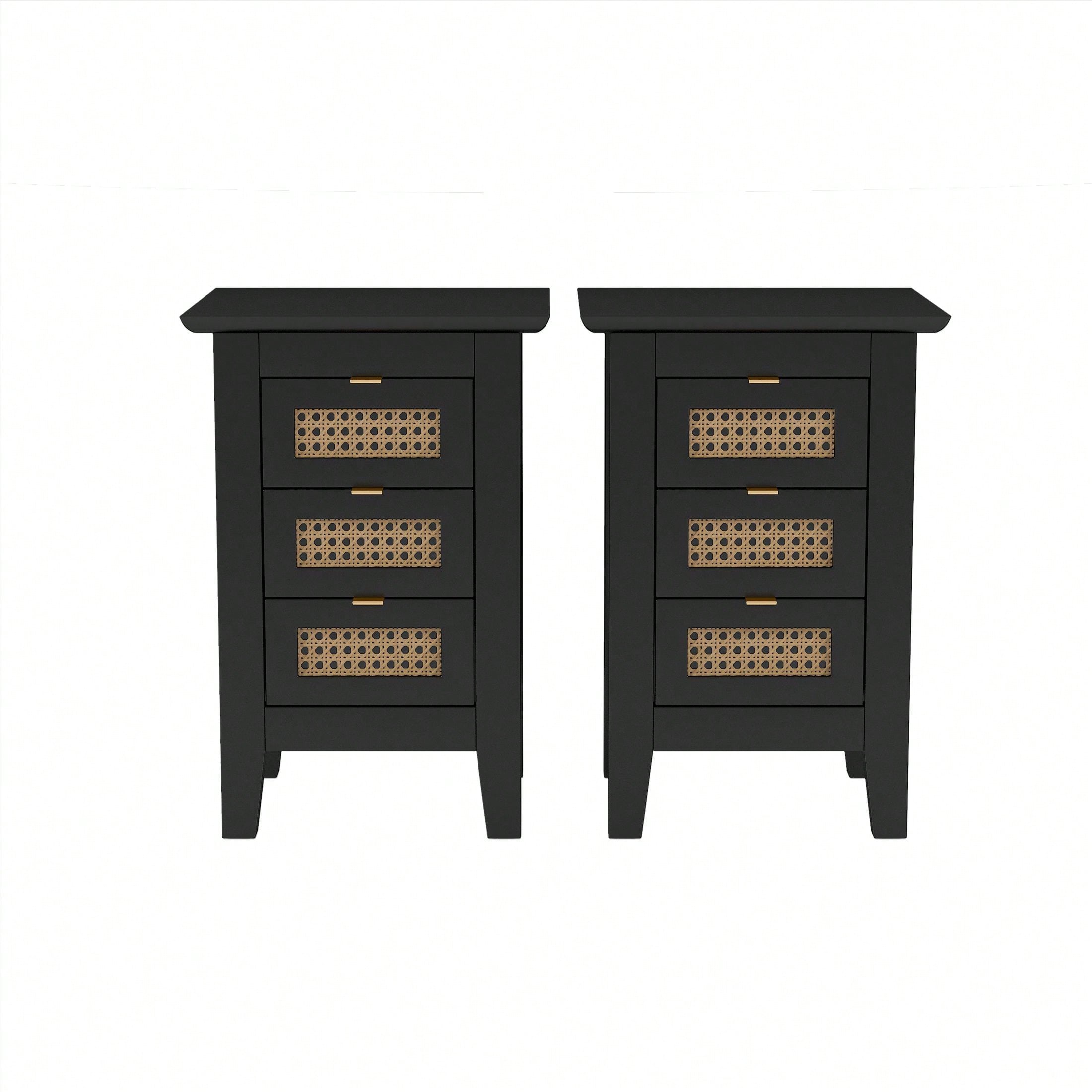 Set Of 2, Rattan-Woven Nightstand With Three Drawers, Exquisite Elegance For Bedroom