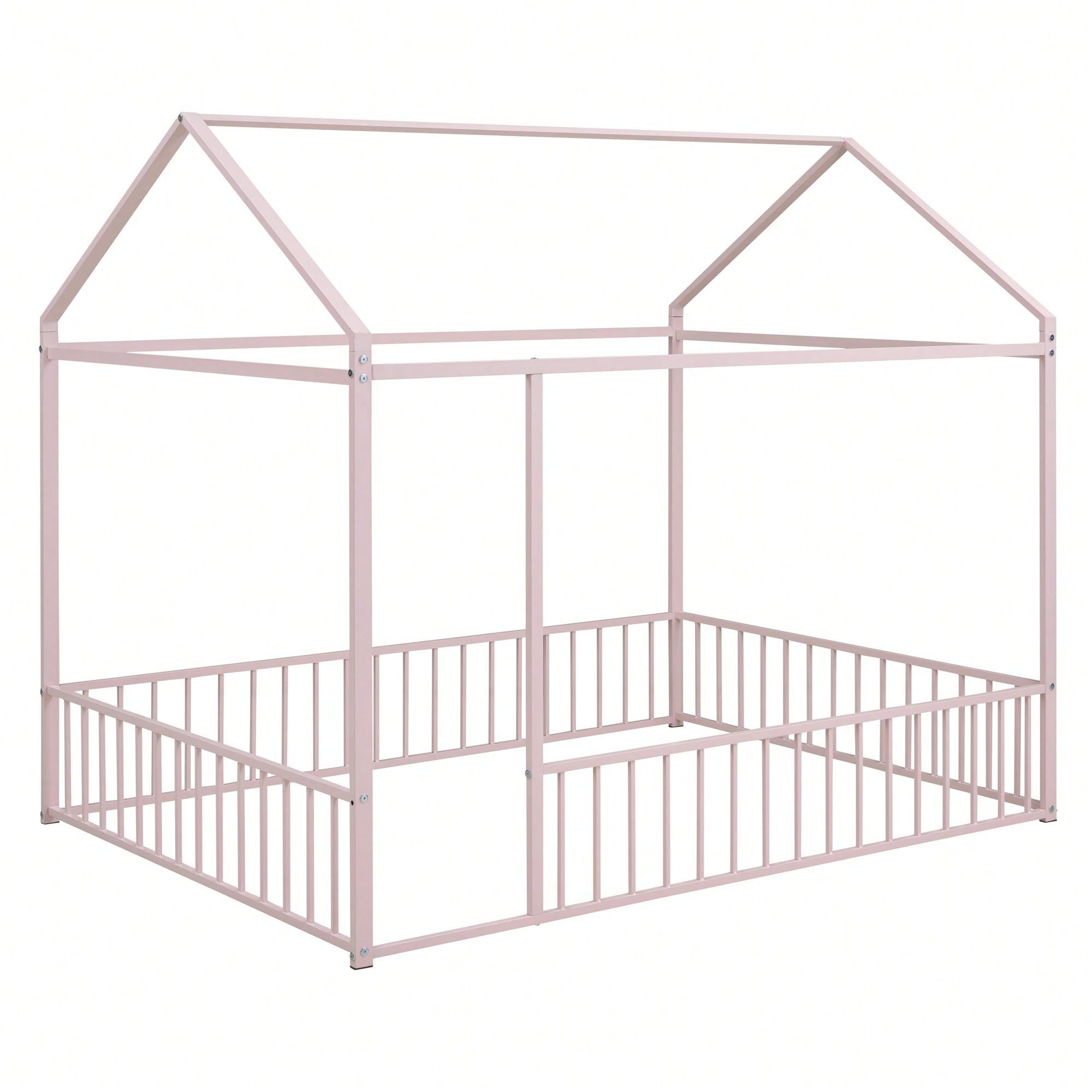 Full Size Metal Bed House Bed Frame With Fence, For Kids, Teens, Girls, Boys