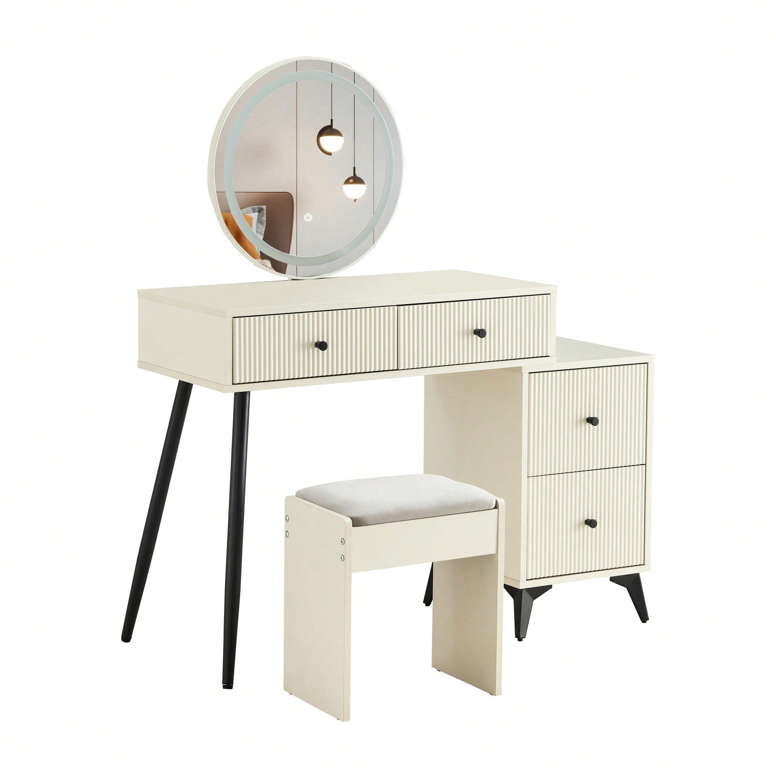 Modern Fluted Vanity Desk with LED Round Mirror and Glass Top, 4 Drawer Makeup Table with Adjustable Shelves