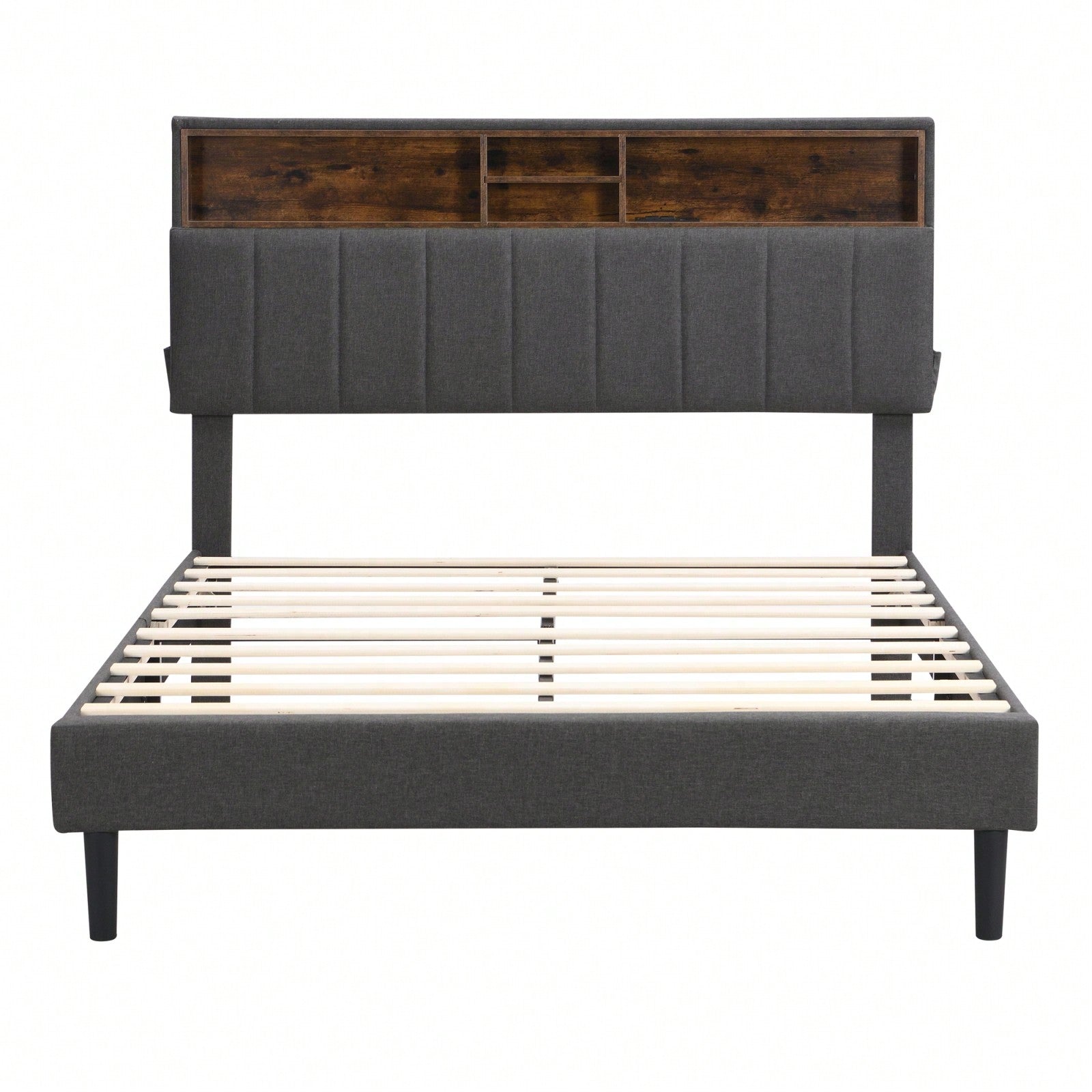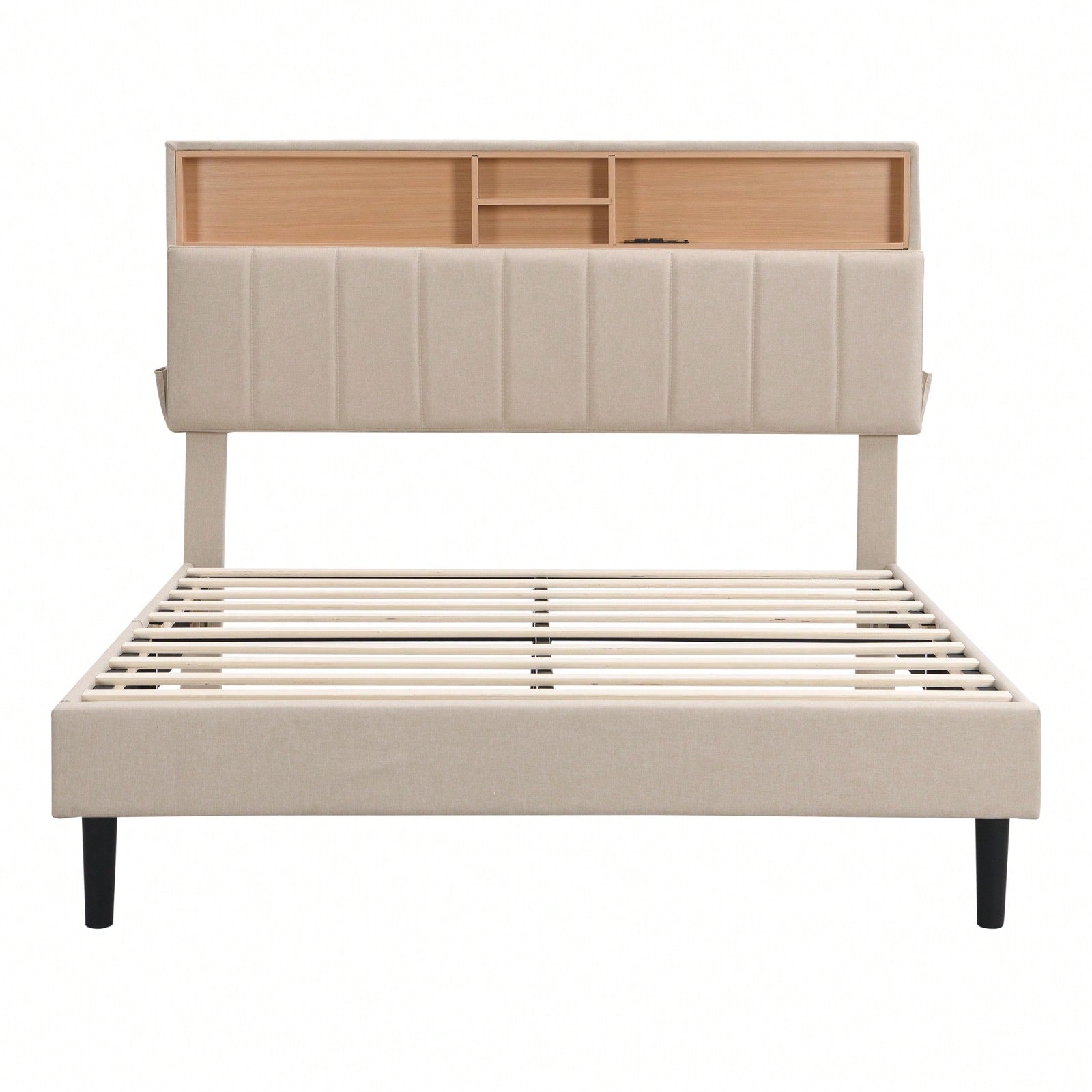 Upholstered Platform Bed With Storage Headboard And USB Port, Linen Fabric Upholstered Bed
