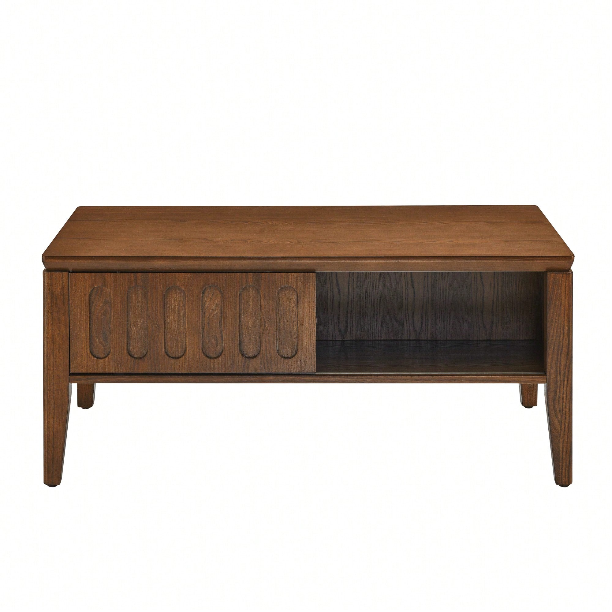 Mid Century Modern Fluted Coffee Table with Sliding Storage and Solid Wood Legs for Living Room or Office