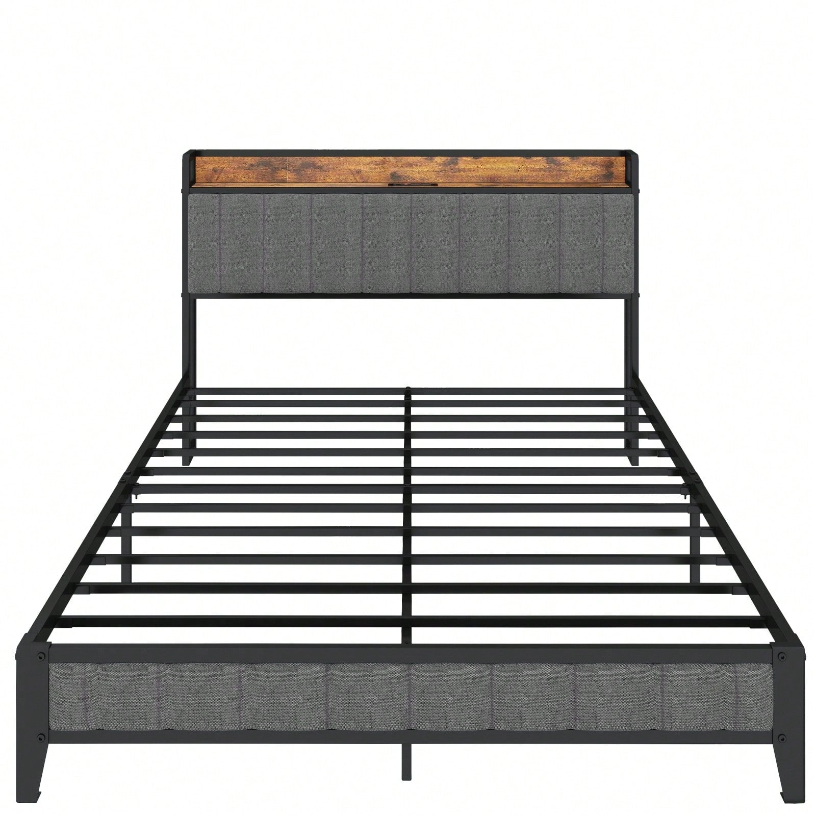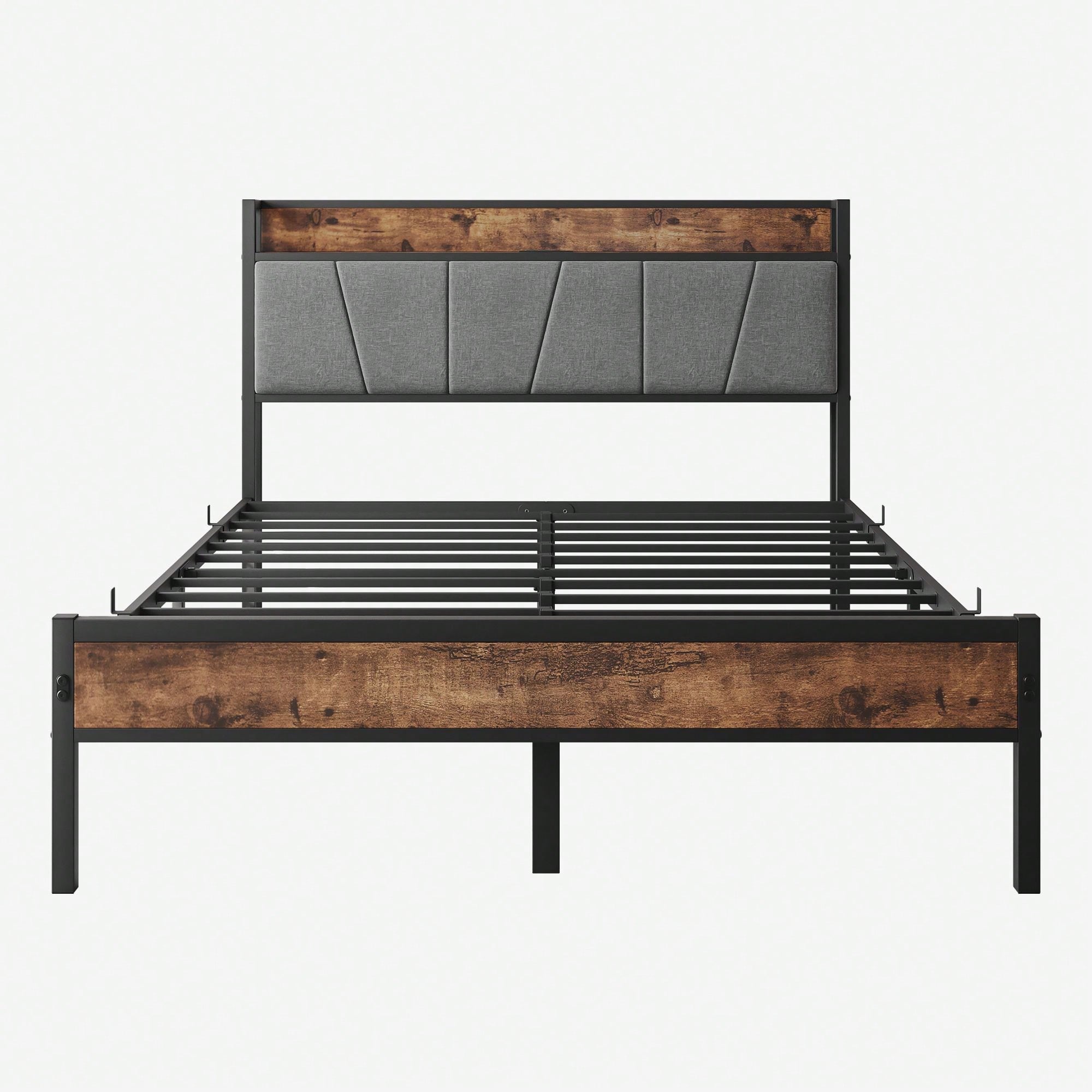 Vintage Full Size Bed Frame with Charging Station Upholstered Headboard Heavy-Duty Metal Slats No Box Spring Needed