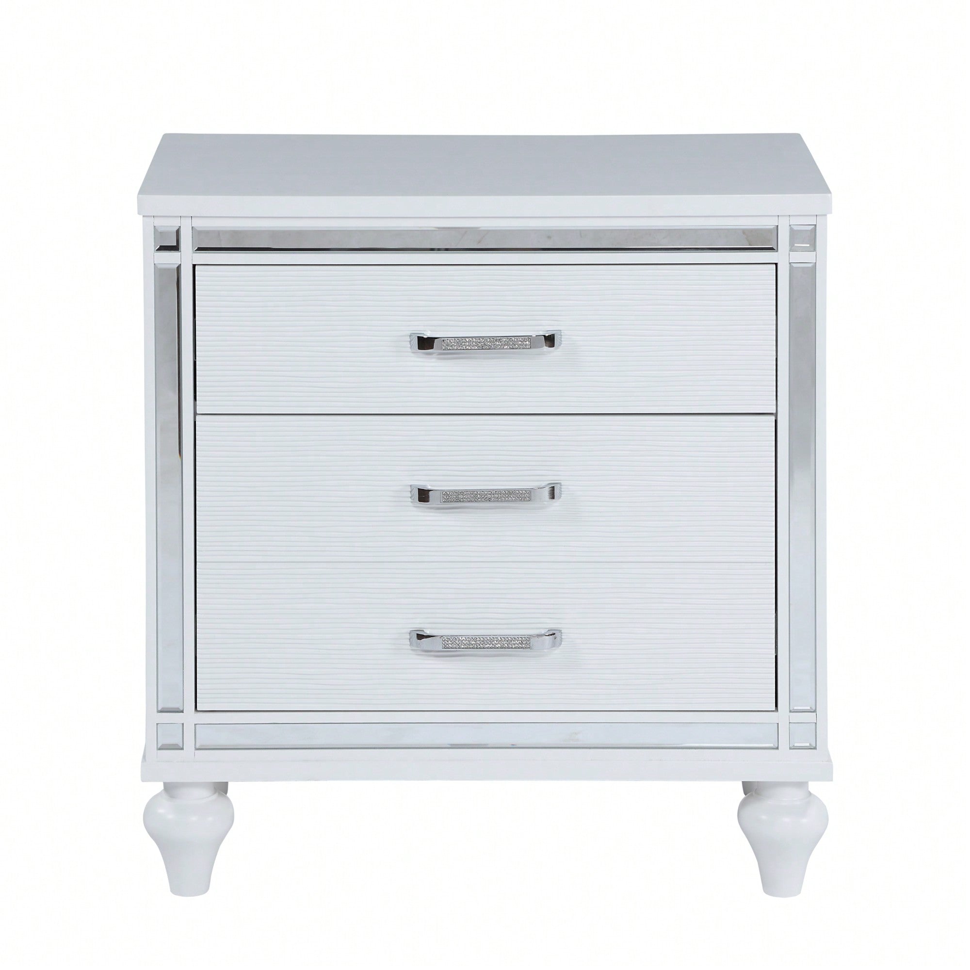 Elegant Sleek White Nightstand with Mirror Accents Stylish Two-Drawer Bedside Table with Hidden Storage and Crystal Pulls