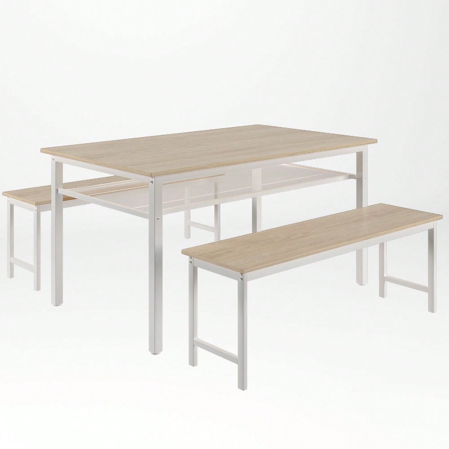 3 Pieces Farmhouse Kitchen Table Set With Two Benches, Metal Frame And MDF Board