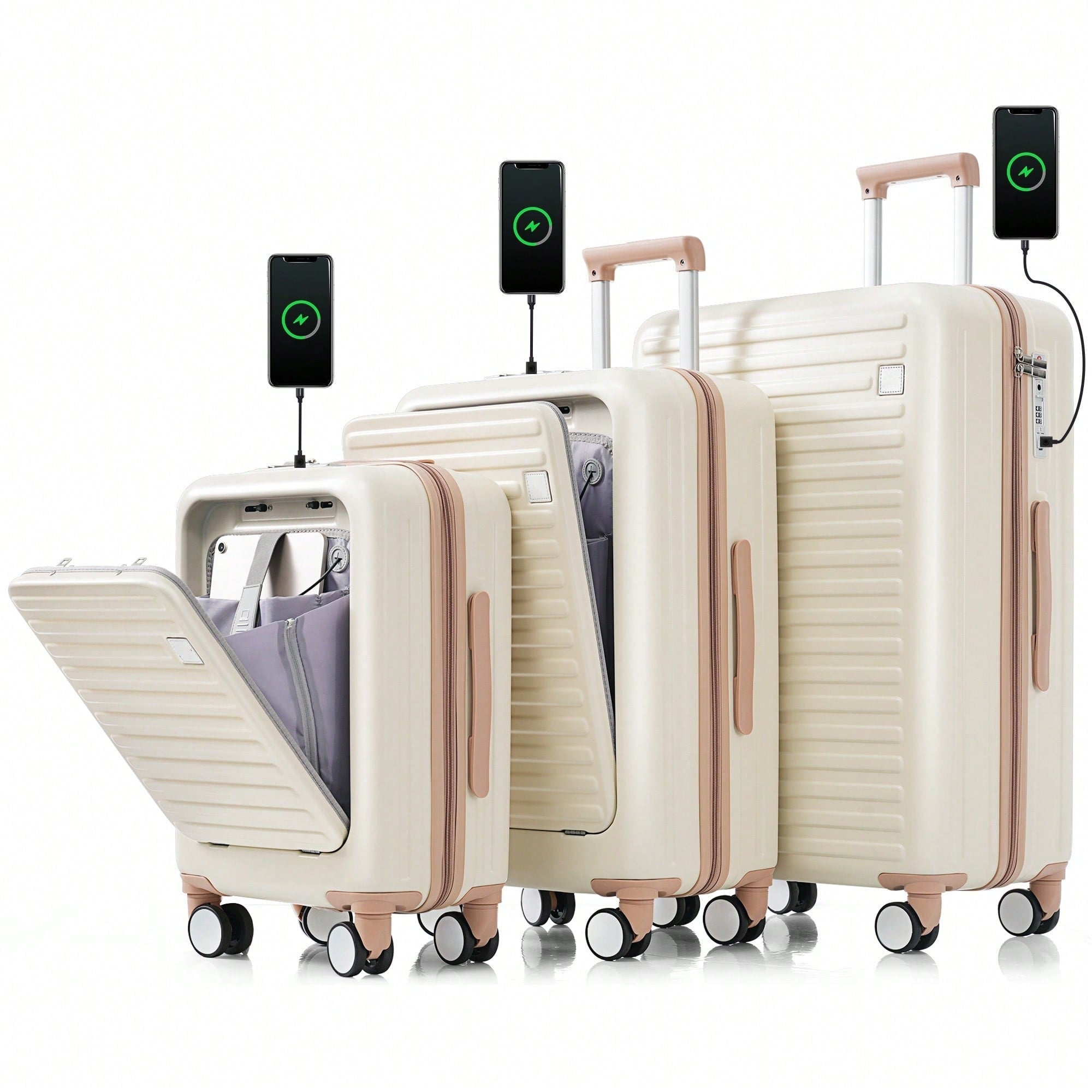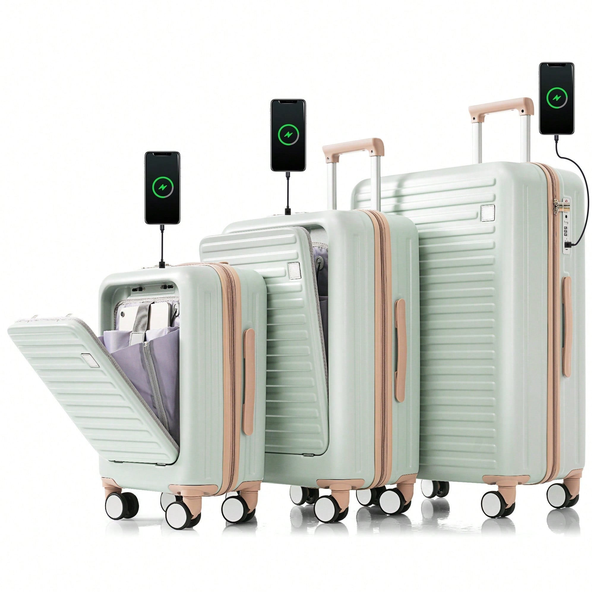 3-Piece Luggage Set With USB Port And Front Opening Design, 20, 24, 28 Inch Hard Shell Suitcases With Spinner Wheels And Cup Holder