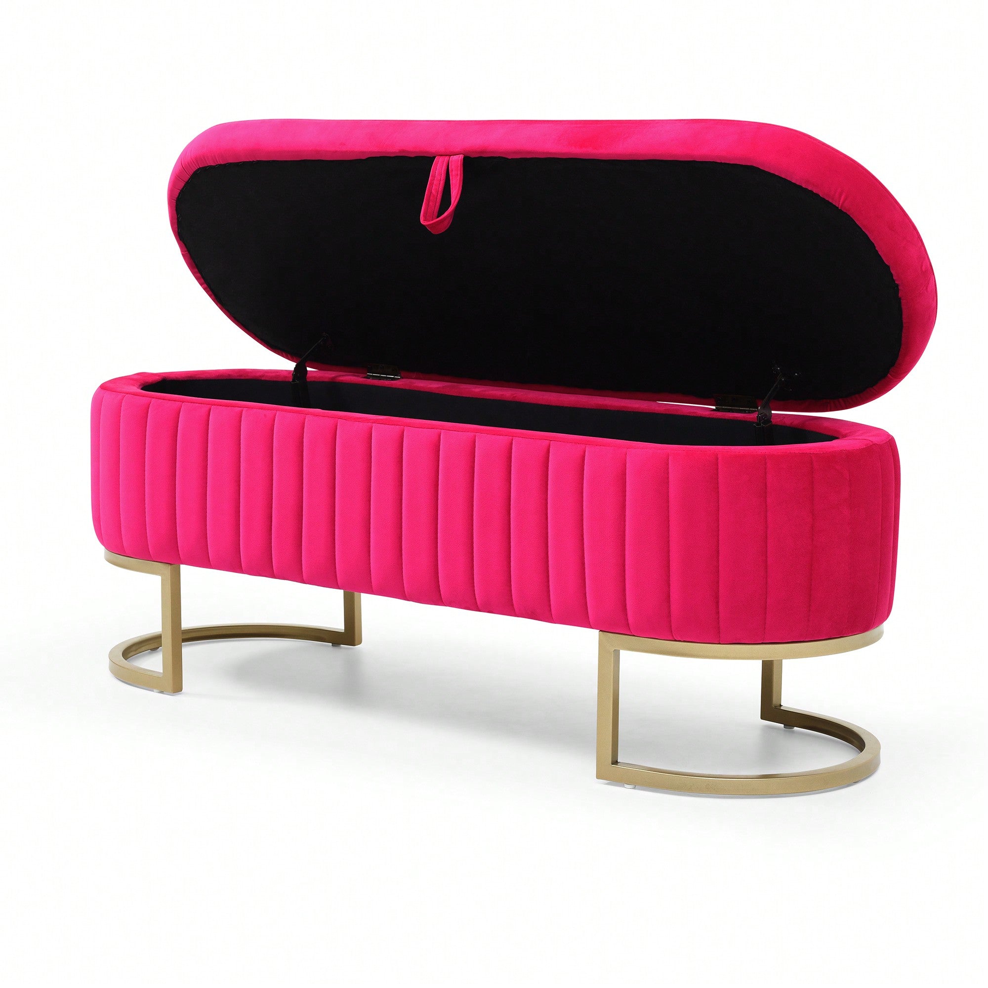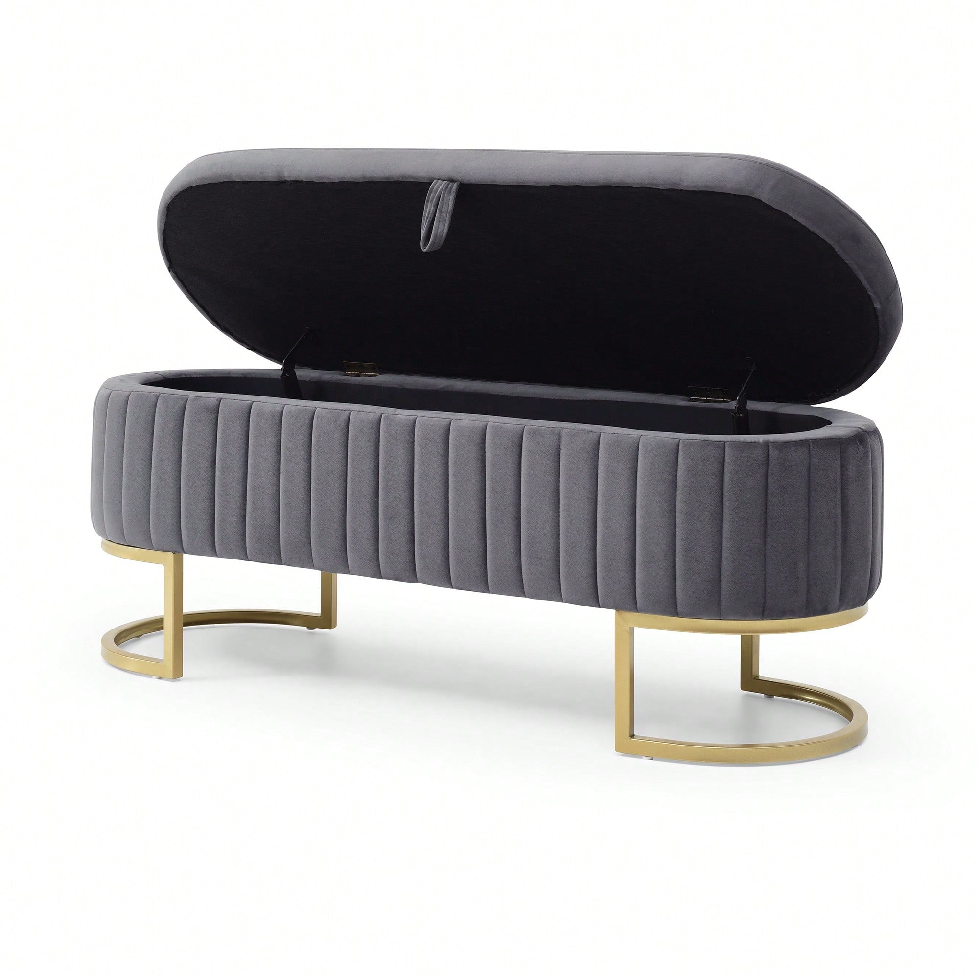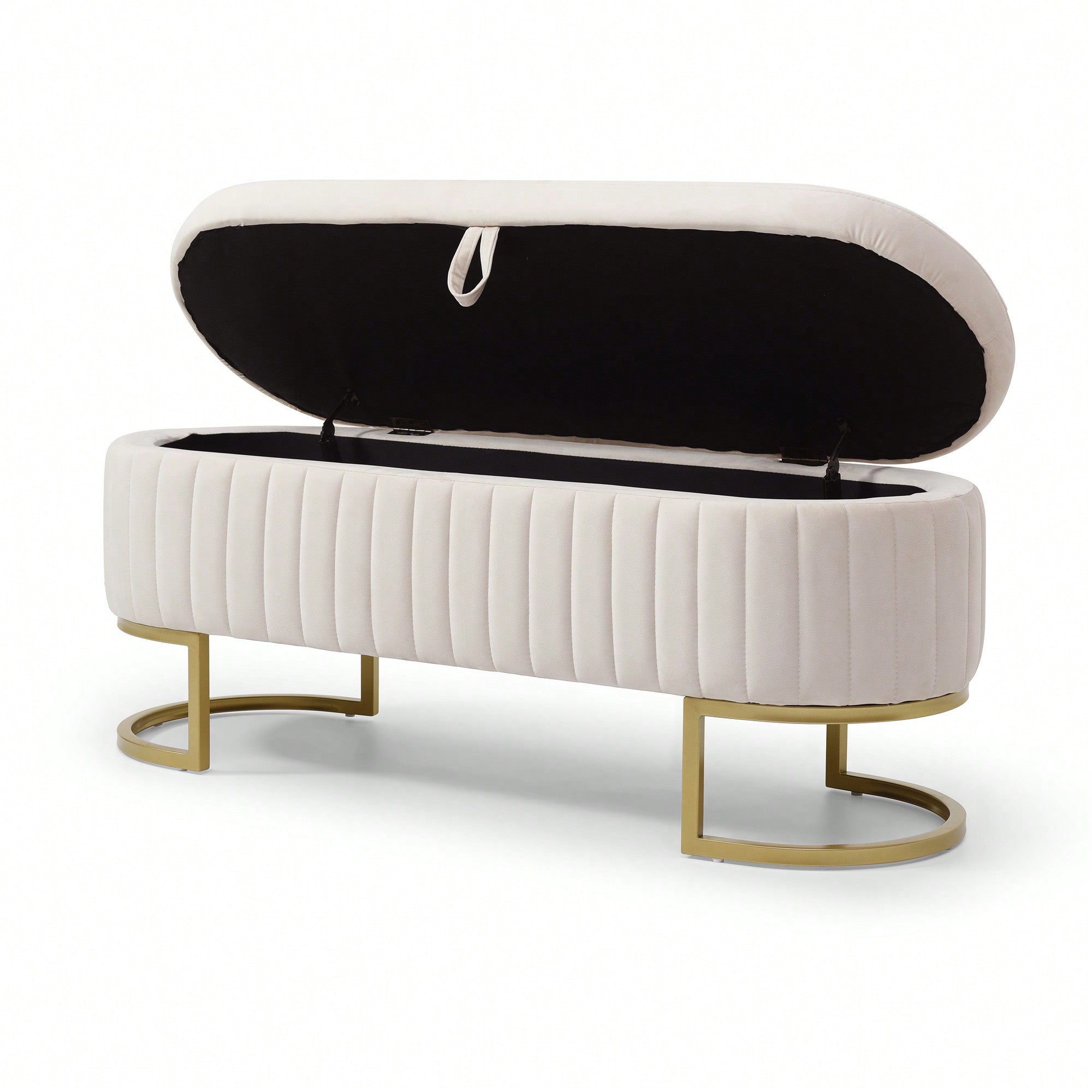 Modern Velvet Oval Storage Bench With Golden Metal Legs For Bedroom Living Room Entryway 50 Inch Upholstered Ottoman With Hidden Storage