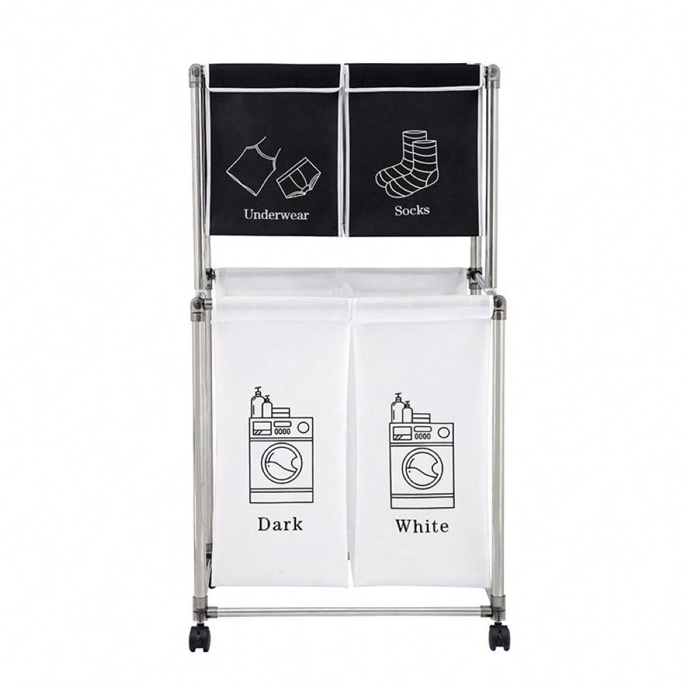 2 Tier Clothes Sorter With 4 Removable Bags To Organize Clothes, With Four Wheels, Easy To Move, Laundry, Light, Dark