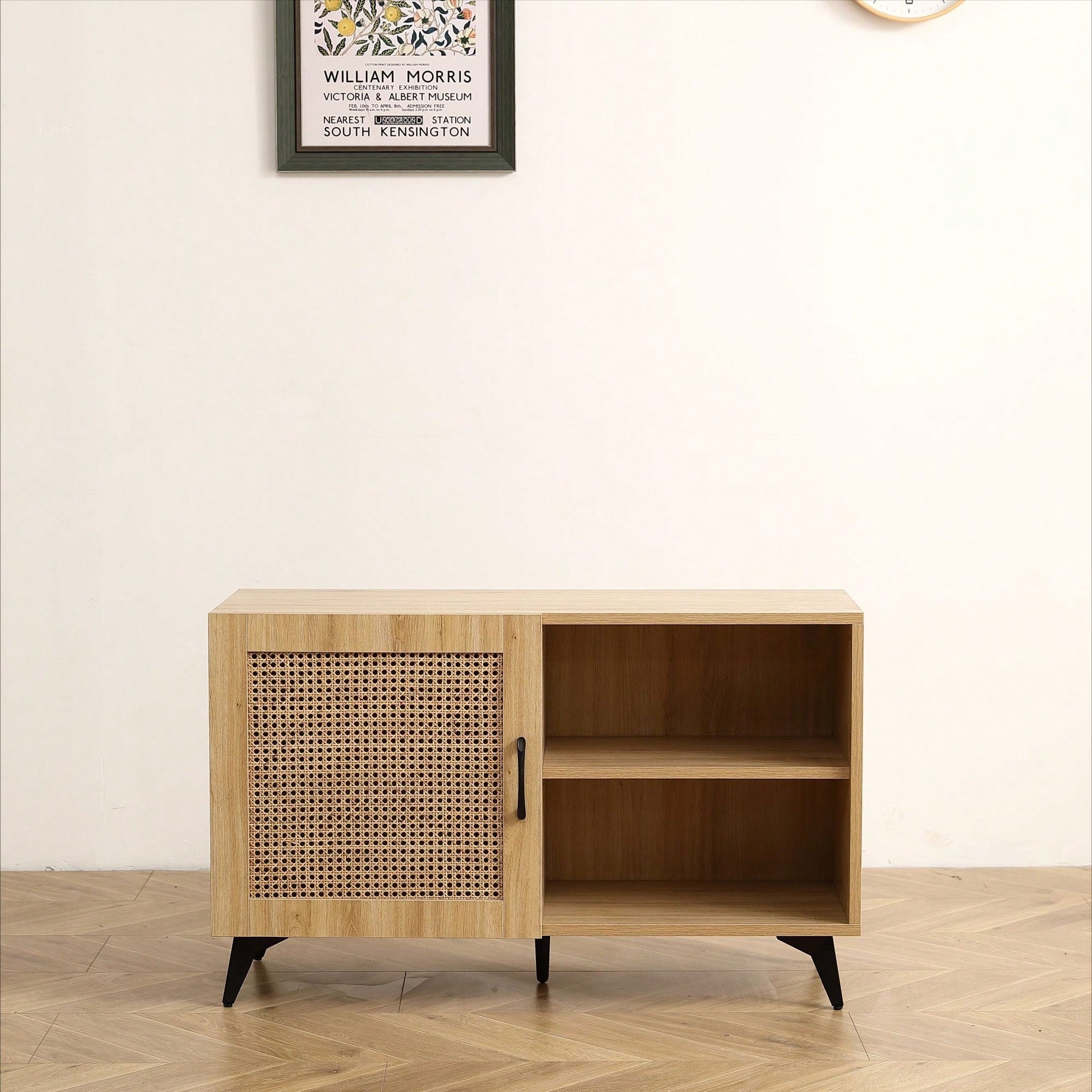 Shoe-Storage Cabinet With Natural Rattan Mesh Door And Solid Wooden Handle