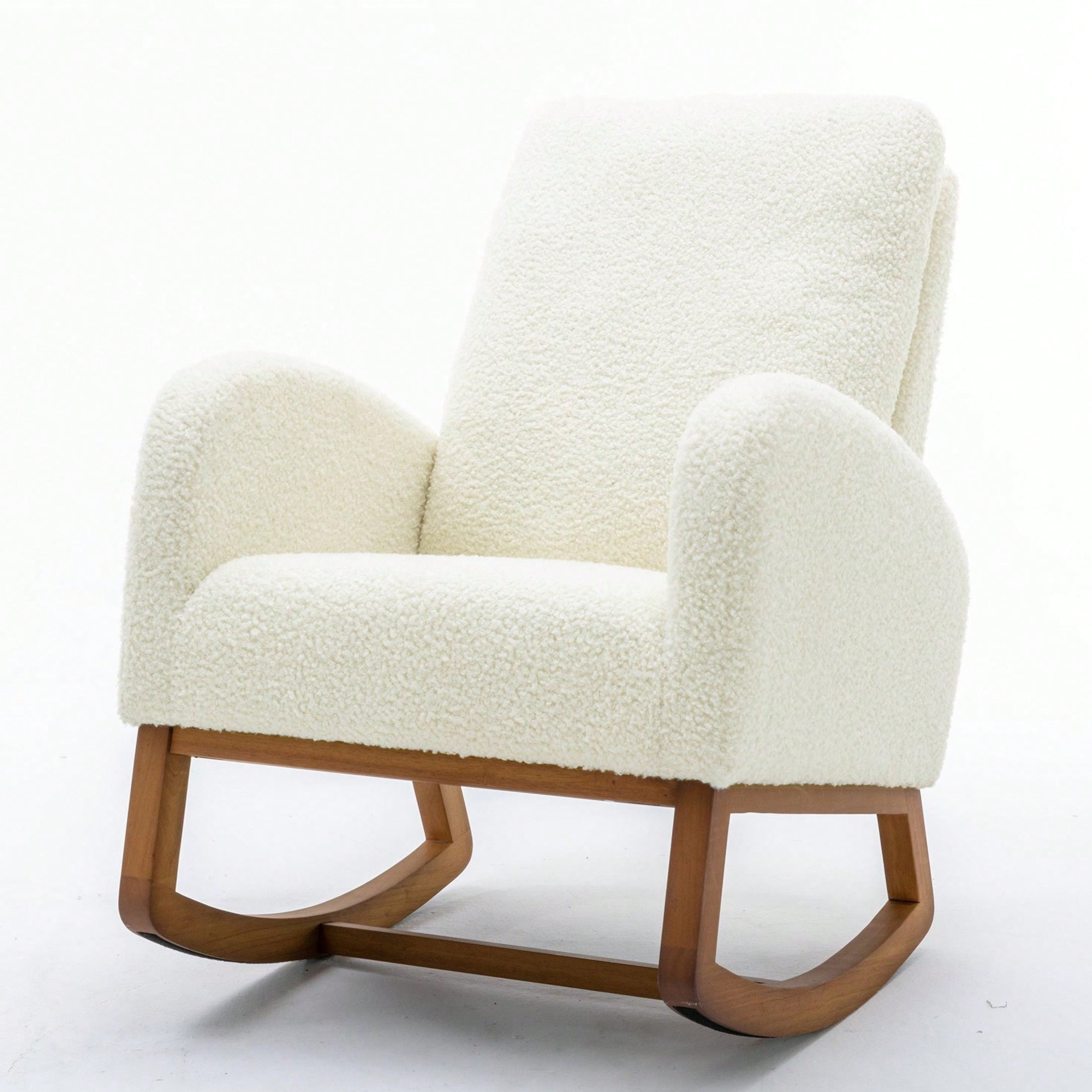 Mid-Century Modern Solid Wood Rocking Chair with Upholstered Cushion Cozy Armrests and High Backrest for Living Room