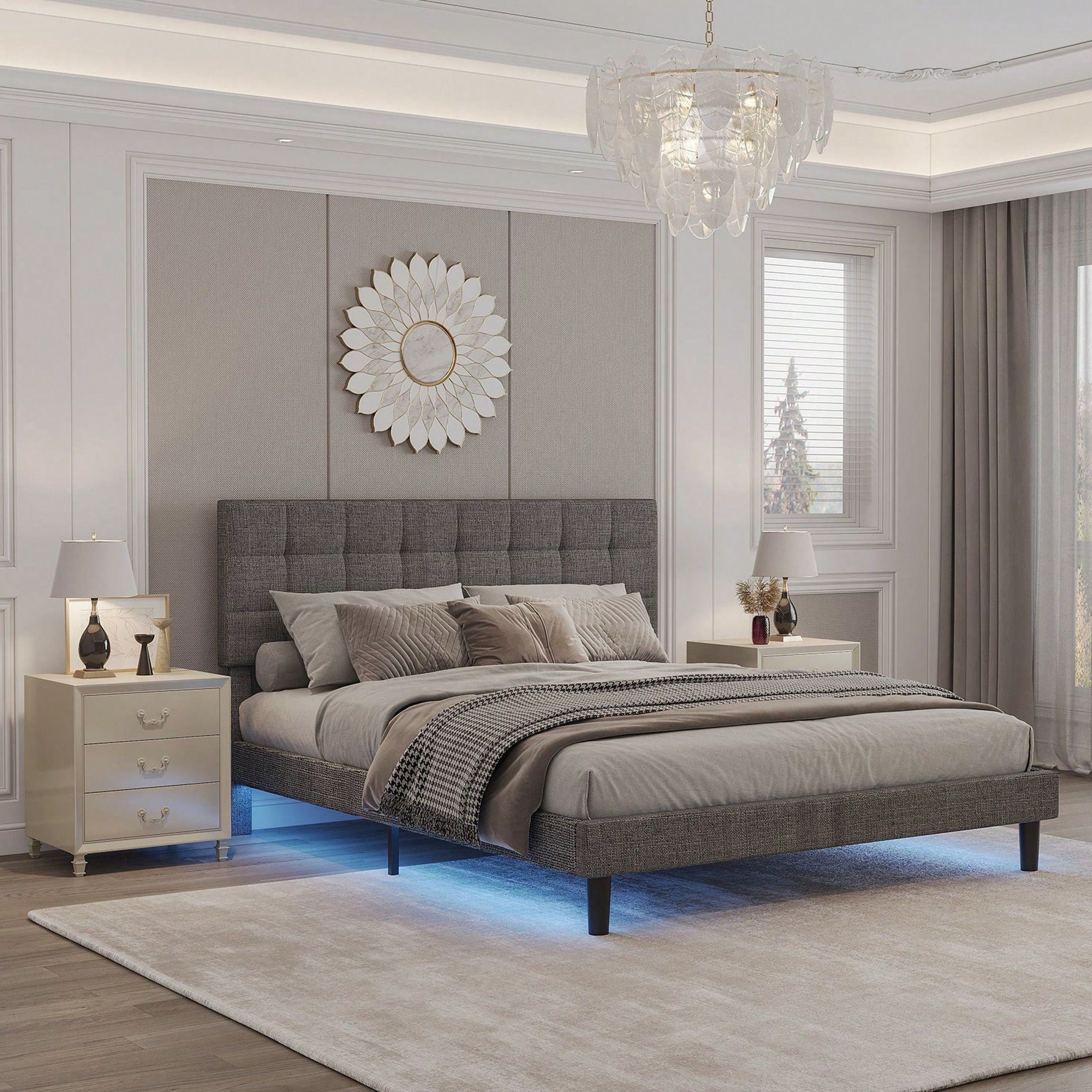 Queen Size Upholstered Platform Bed With Lights, Square Stitched Adjustable Headboard, Strong Bed Slats System, No Box Spring Needed