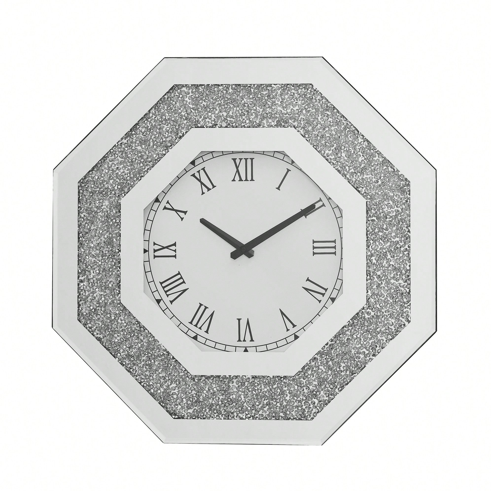 Octagonal Mirror Wall Clock With Roman Numerals And Faux Gemstone Inlay, Modern Glam Design, 20x20 Inches