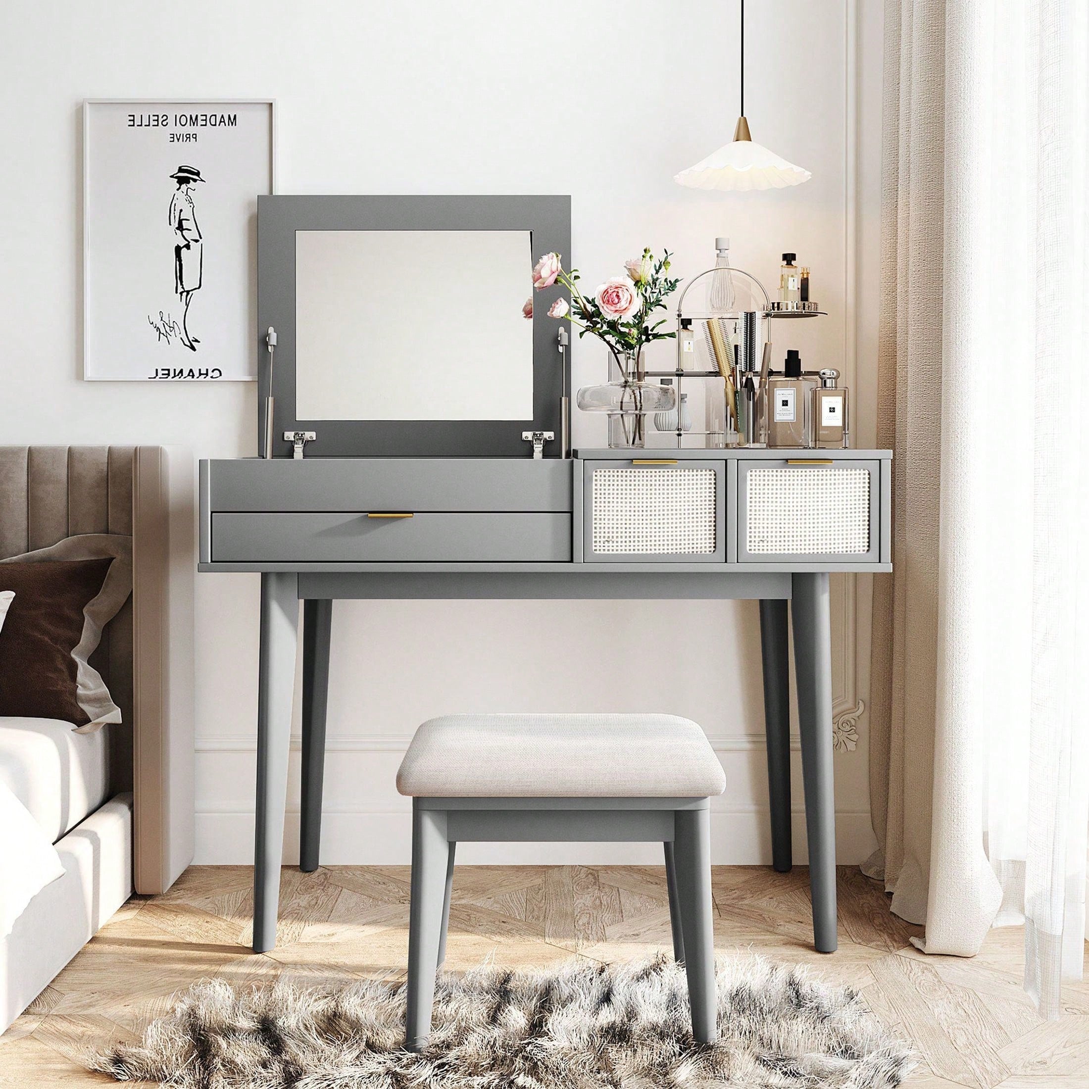 43.3" Classic Wood Makeup Vanity Set With Flip-Top Mirror And Stool, Dressing Table With Three Drawers And Storage Space