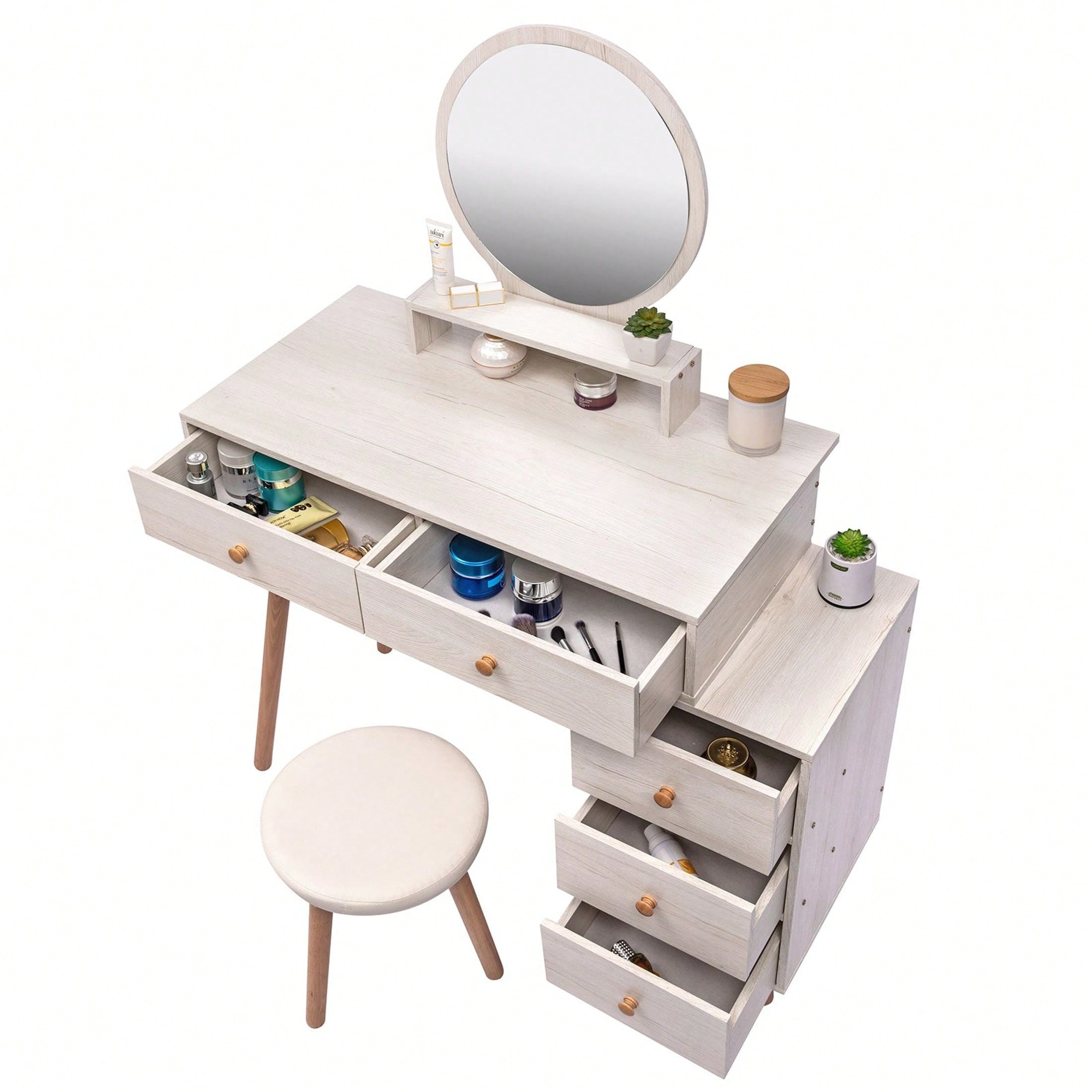 Makeup Vanity Table With Cushioned Stool, Large Capacity Storage Cabinet, 5 Drawers, Large Round Mirror, Fasionable Makeup Furniture