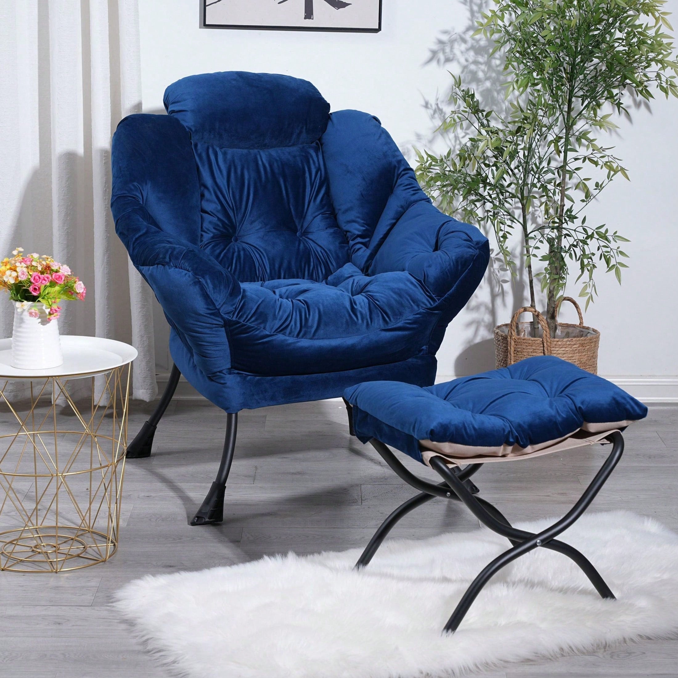Navy Blue Plush Chaise Lounge Chair with Storage and Pillow Modern Upholstered Rolled Arm for Living Room Bedroom Office