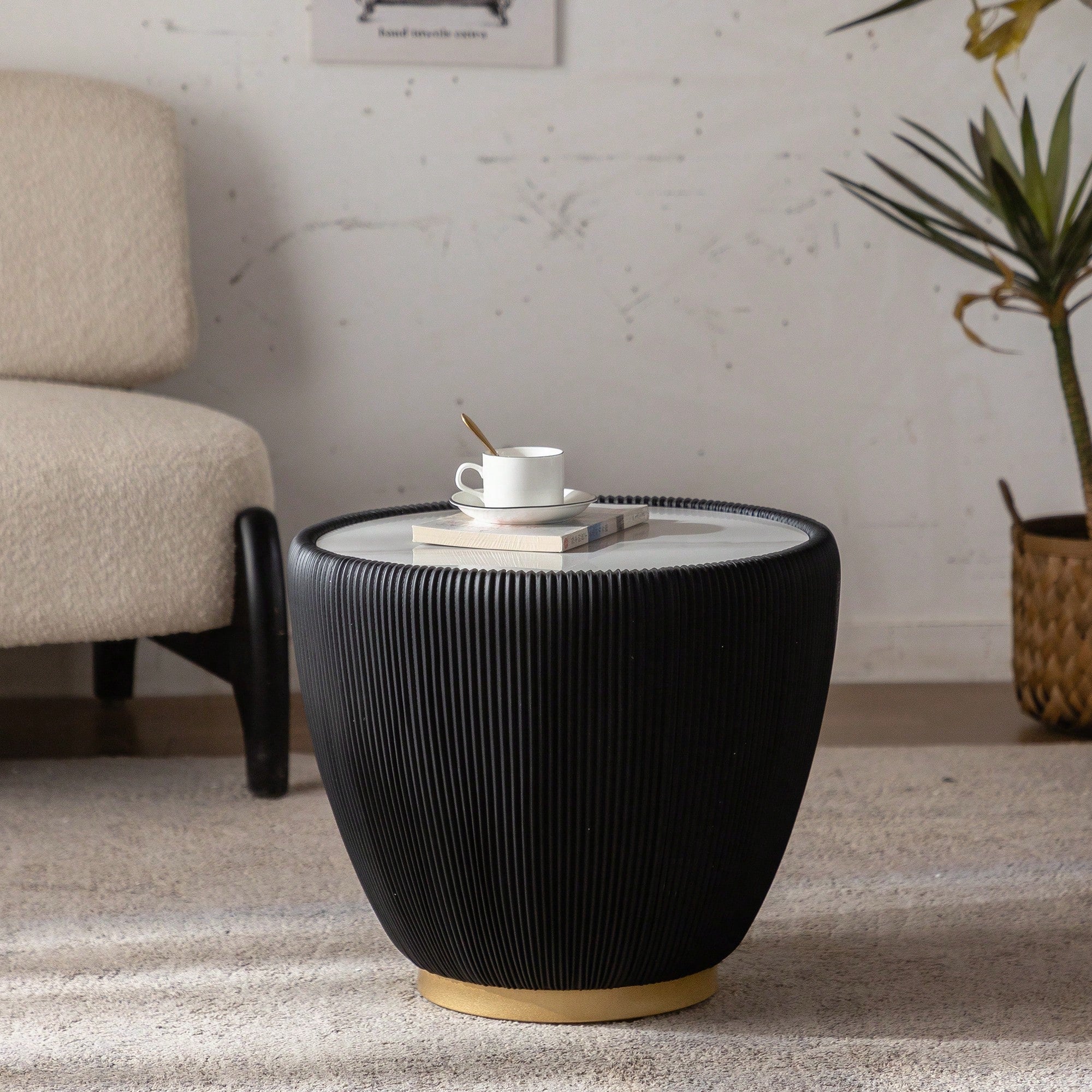 Contemporary Round Drum Coffee Table With Sintered Stone Top PU Leather And Metal Base Black 19.7 Inches