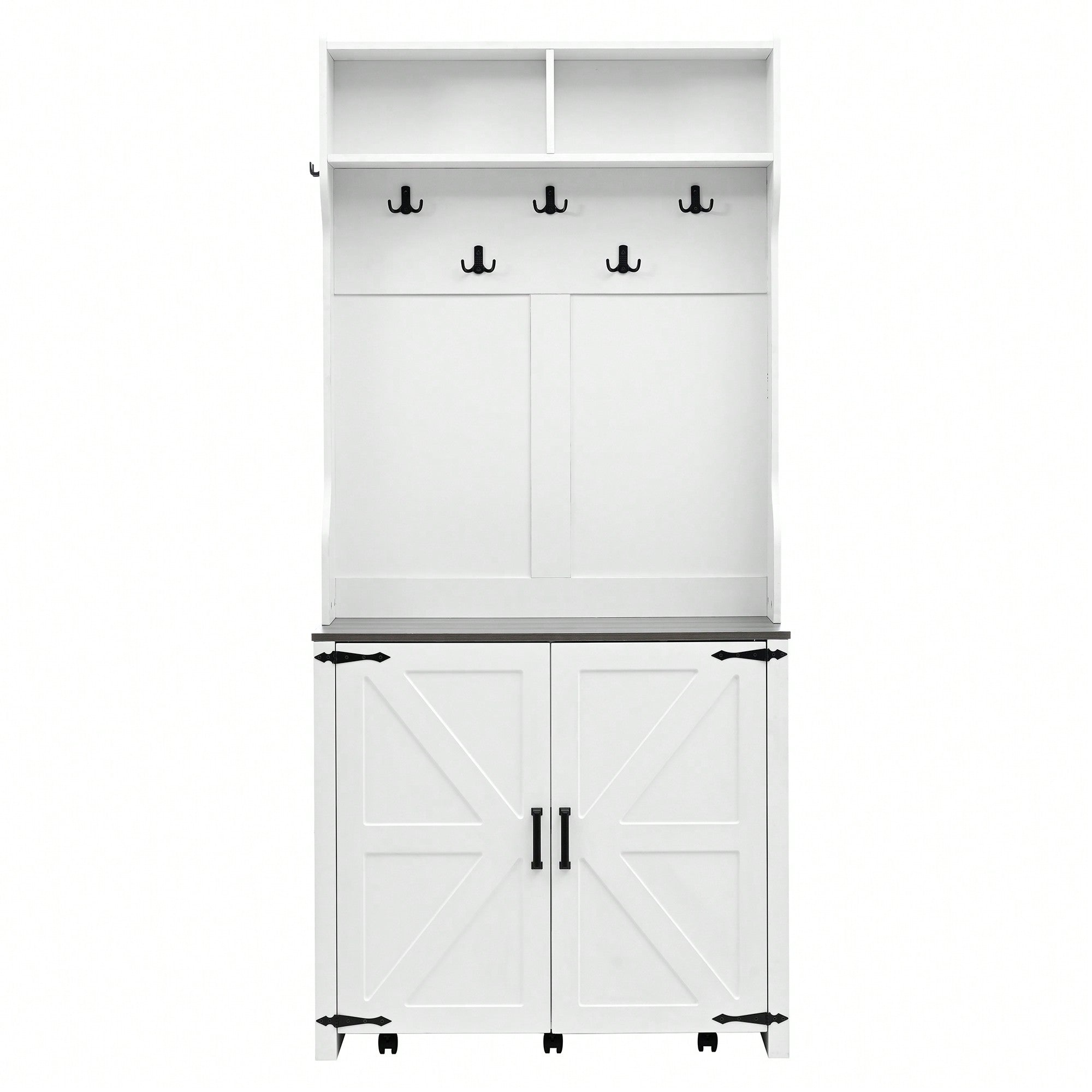 Farmhouse 4-In-1 Hall Tree with Barn Doors Movable Bench 7 Hooks Shoe Storage Cabinet 76.9 Inch Entryway Coat Rack with Wheels White