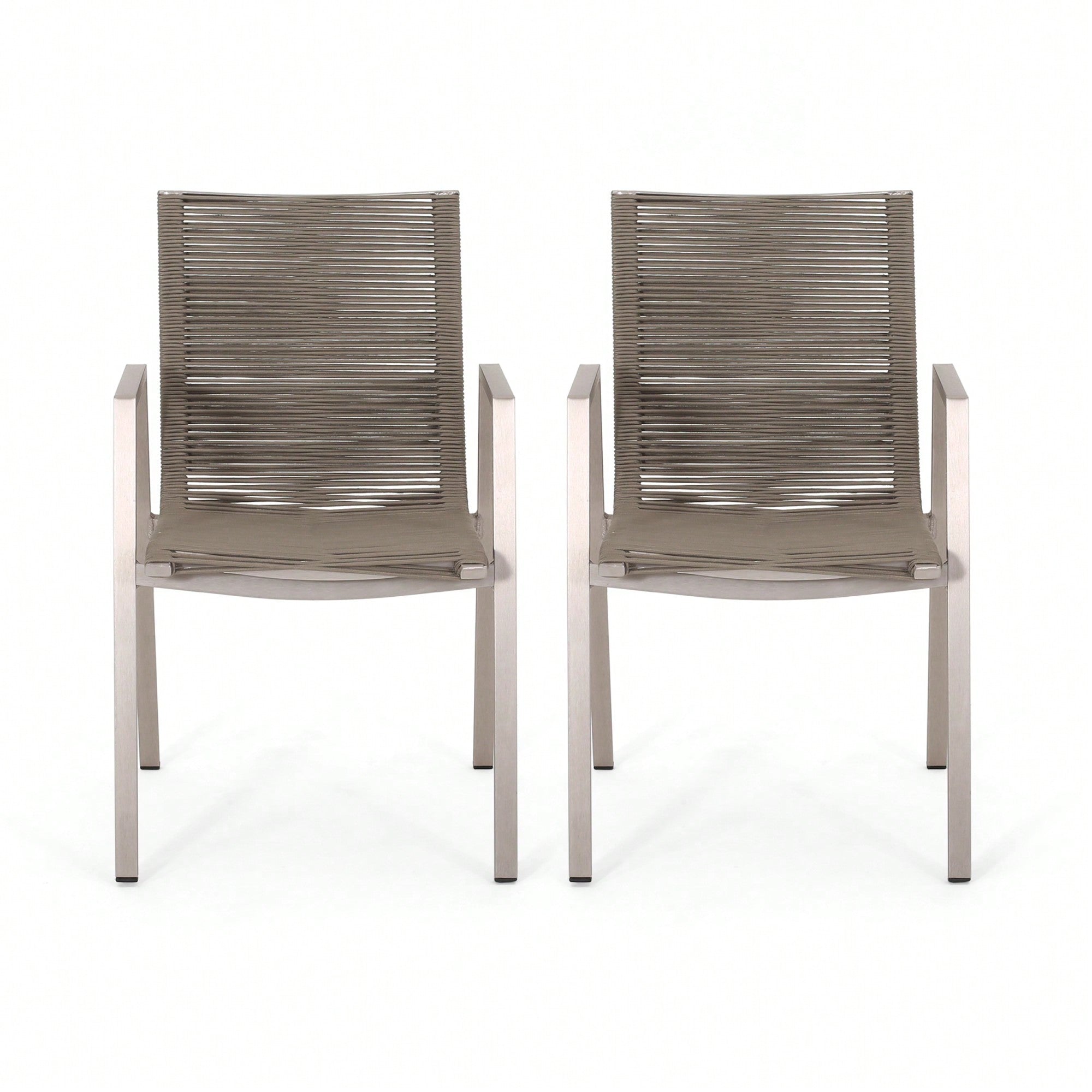Contemporary Outdoor Aluminum Dining Chairs With Rope Seat Set Of 2 Silver And Taupe