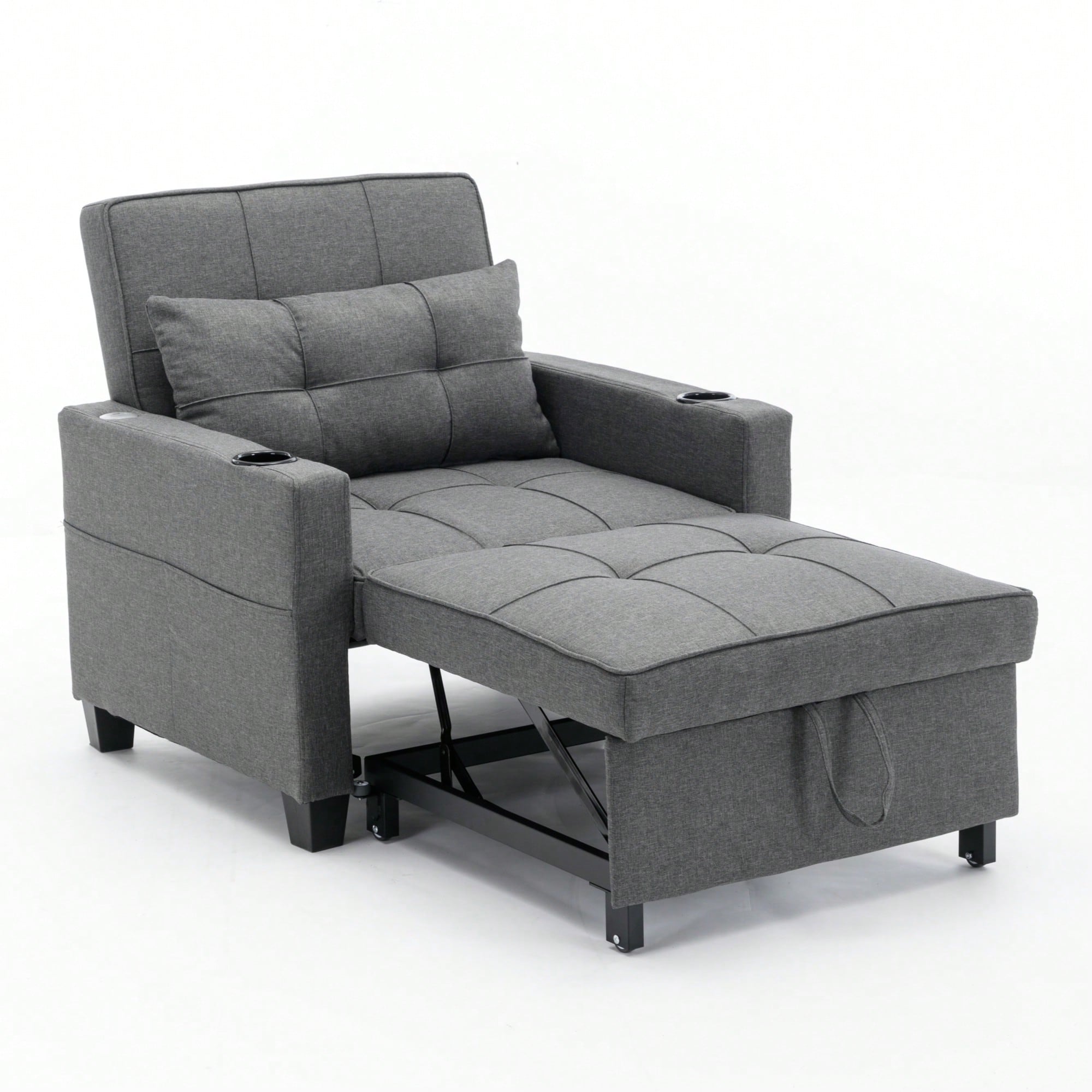 3-In-1 Convertible Futon Chair Bed With USB Ports Wear-Resistant Anti-Scratch Armchair Sleeper For Living Room Dark Grey Linen