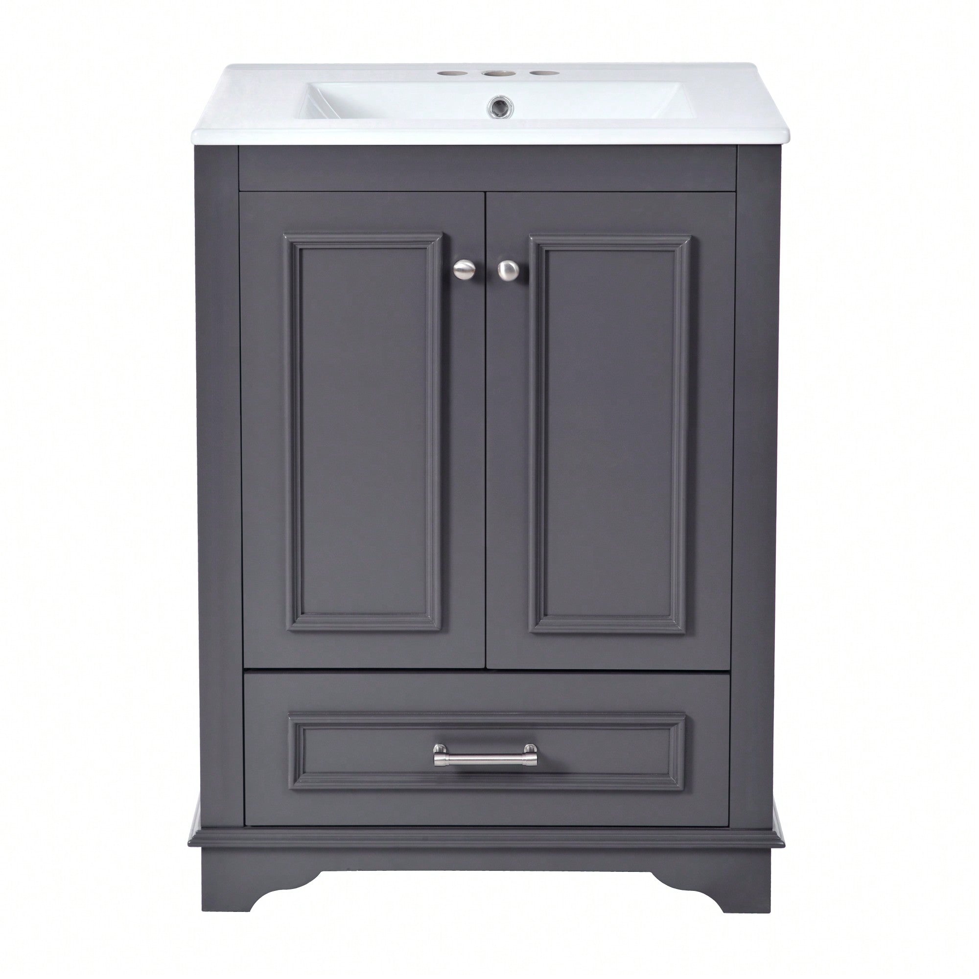 Modern 24 Inch Bathroom Vanity With Ceramic Sink And Soft Closing Doors, Freestanding Storage Cabinet With Silver Handles