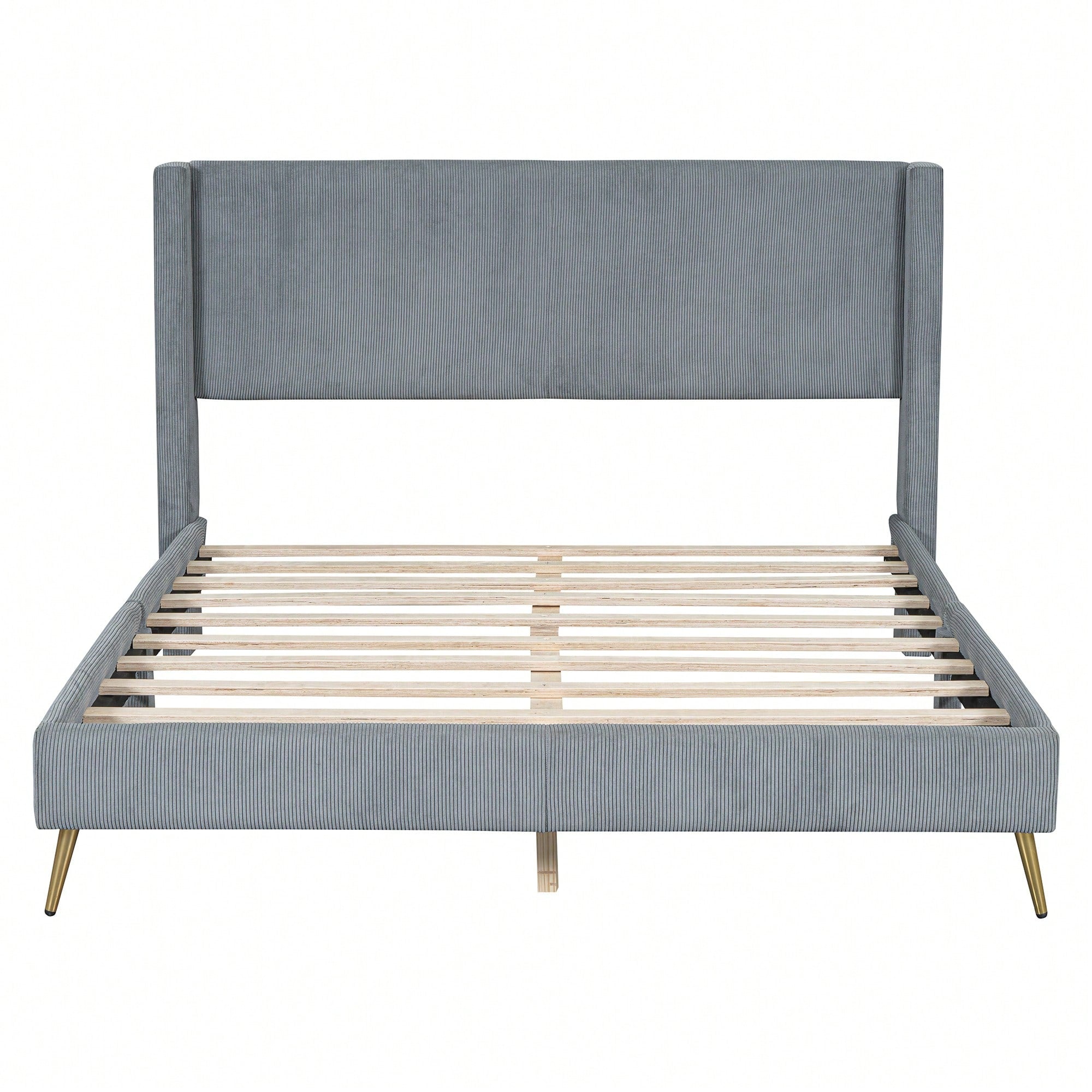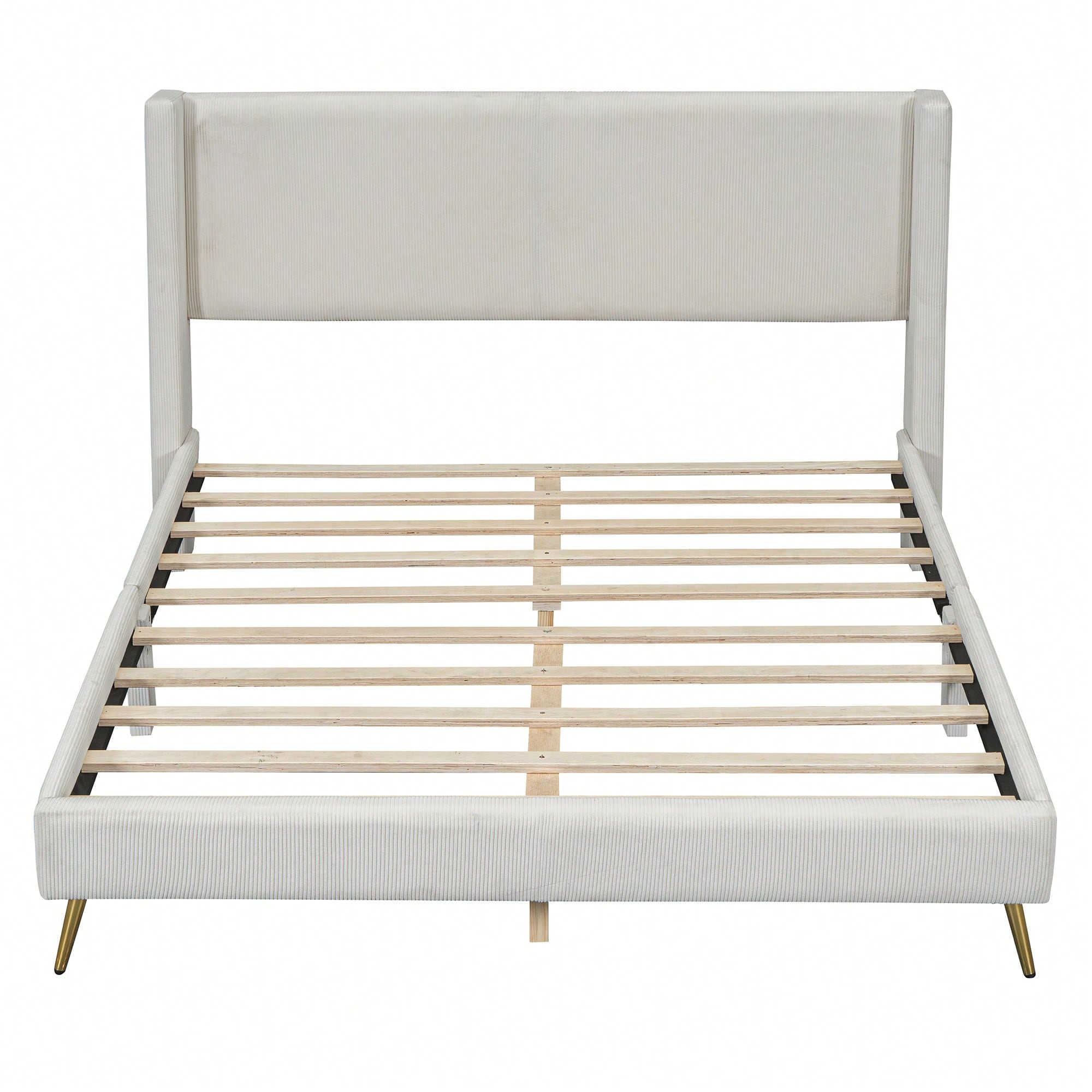 Queen Size Corduroy Platform Bed With Sturdy Metal Legs Beige