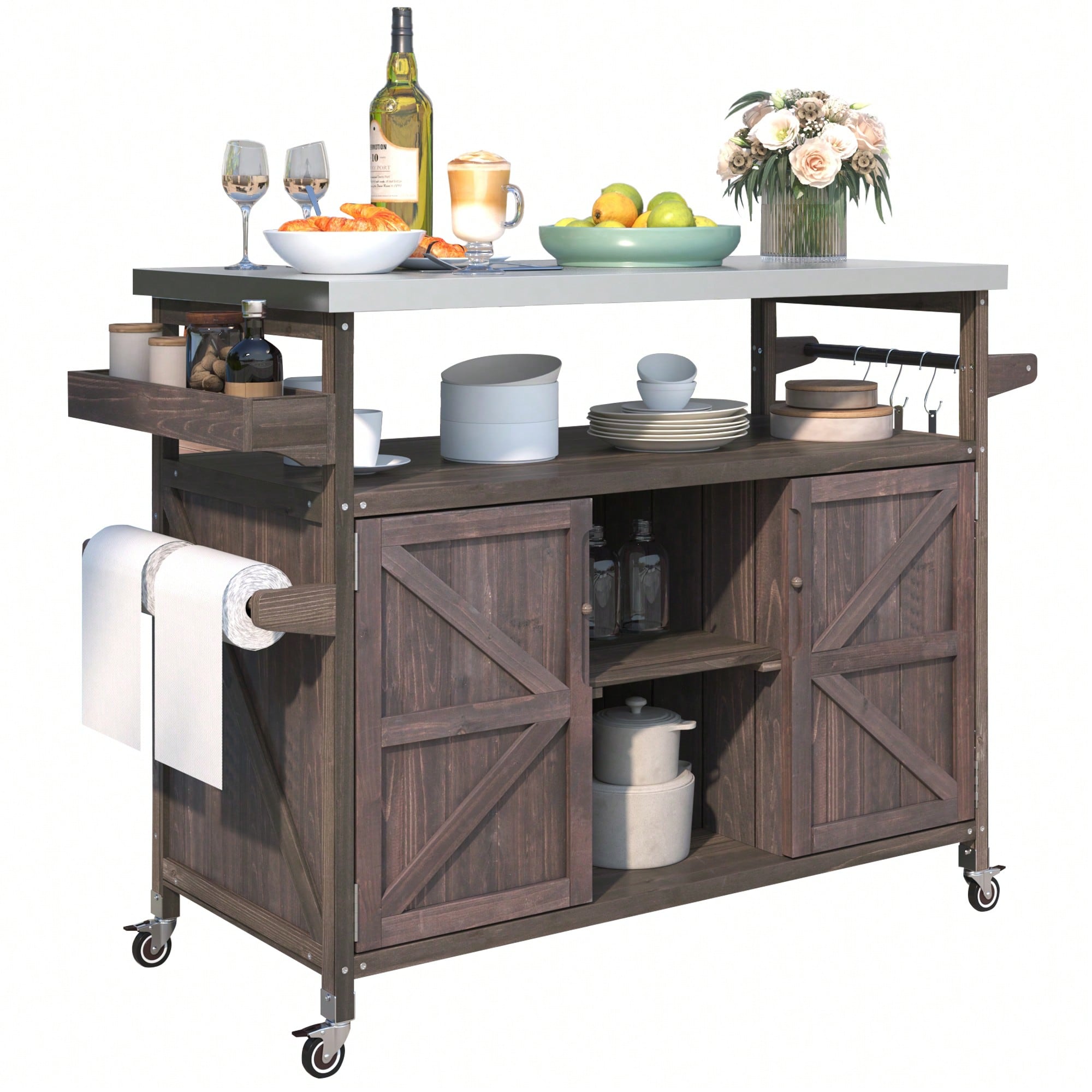 Farmhouse Solid Wood Outdoor Kitchen Island Rolling Bar Cart With Stainless Steel Top Spice Rack And Towel Rack For BBQ And Kitchen Storage