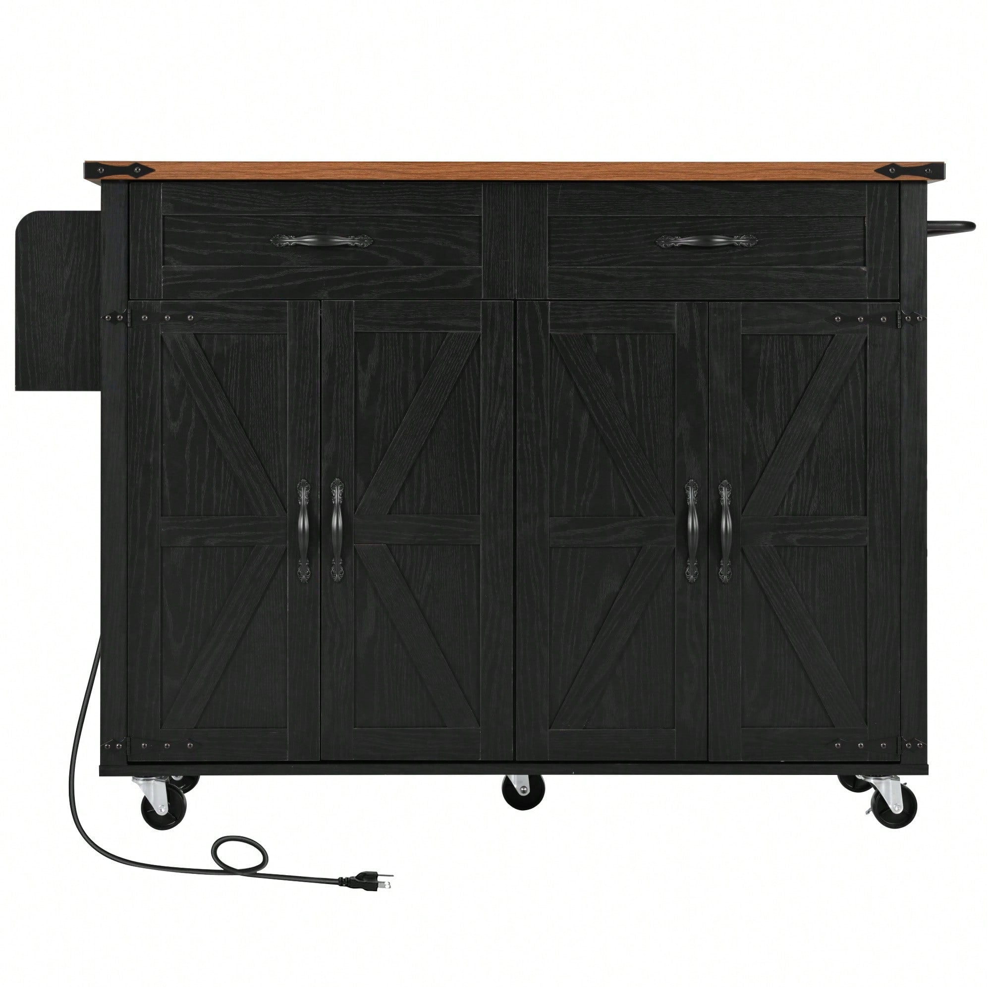 Farmhouse Style Kitchen Island With Power Outlet And Drop Leaf, Rolling Storage Cart With Spice Rack And Drawer For Room, White Finish