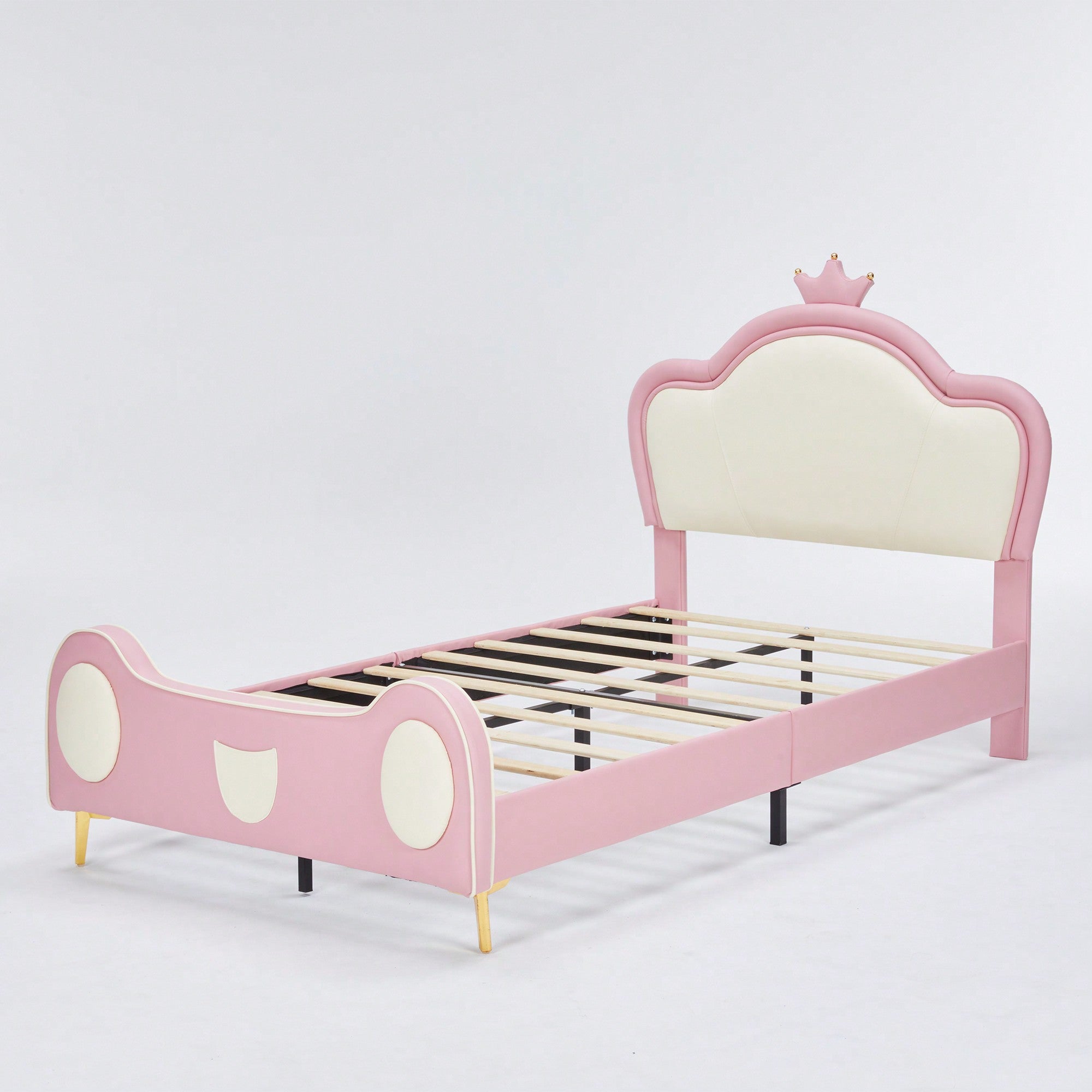 Twin Size Princess Bed With Crown Headboard And Storage Pocket, PU Upholstered Platform Bed For Kids, Easy Assembly, Pink