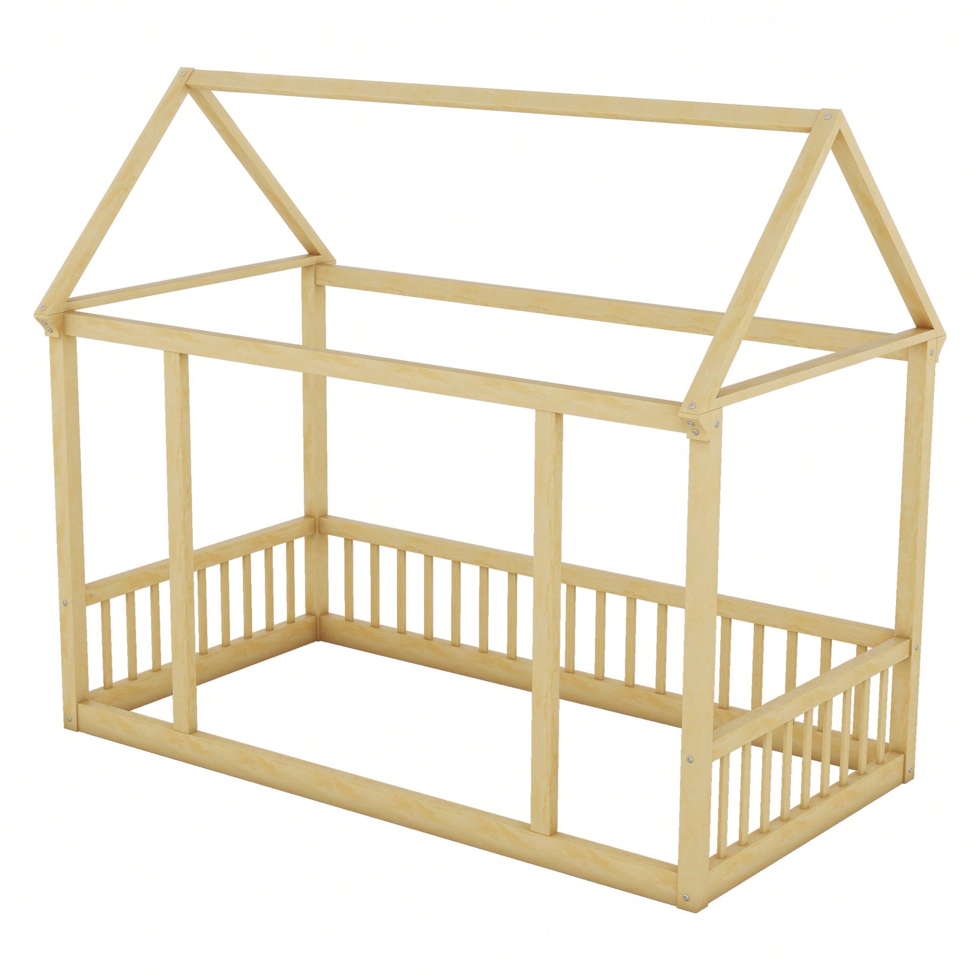 Wooden Twin Size Floor Bed With House Roof Frame And Safety Guardrails In Natural Finish