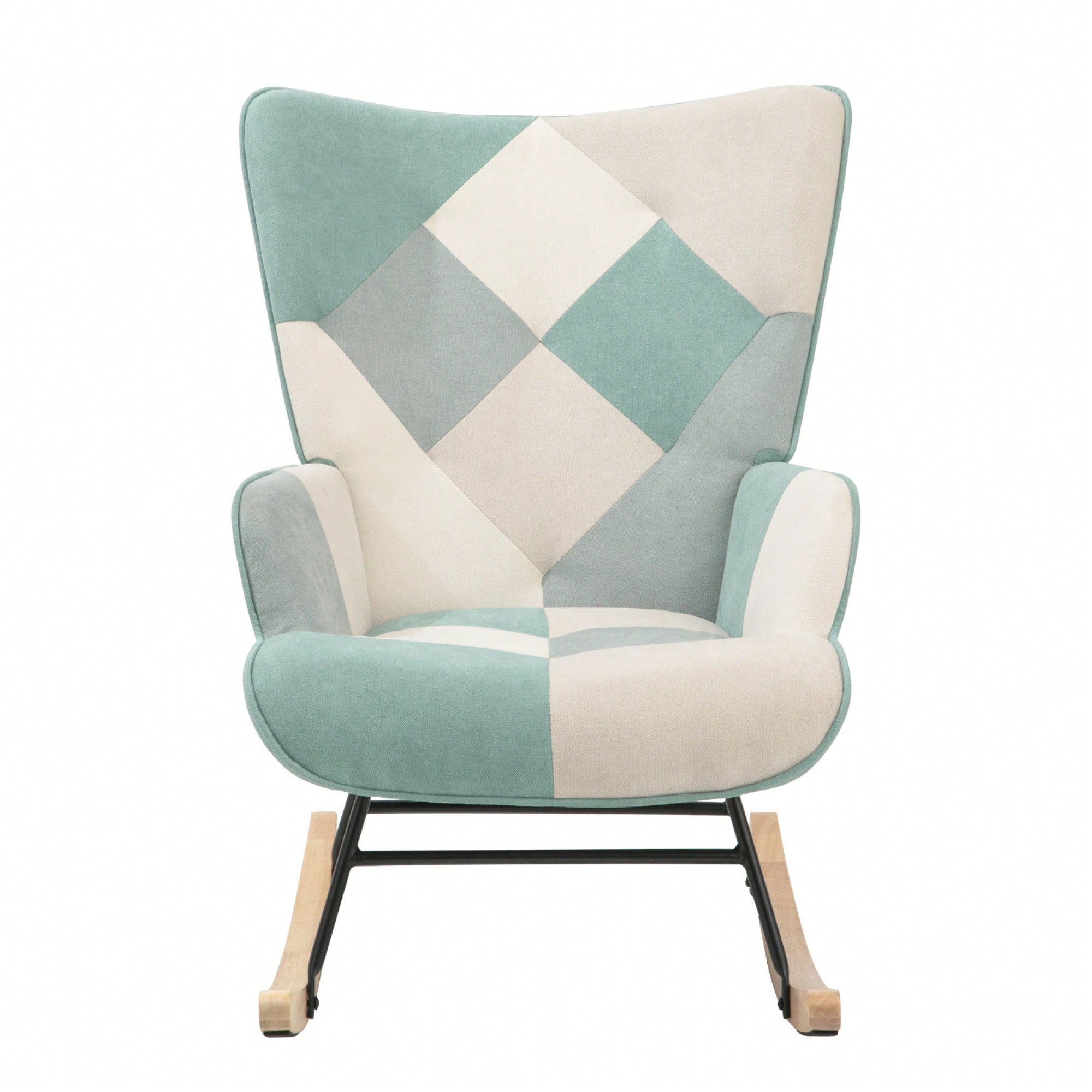 Mid Century Modern Fabric Rocking Chair With Wood Legs And Patchwork Linen For Living Room And Bedroom