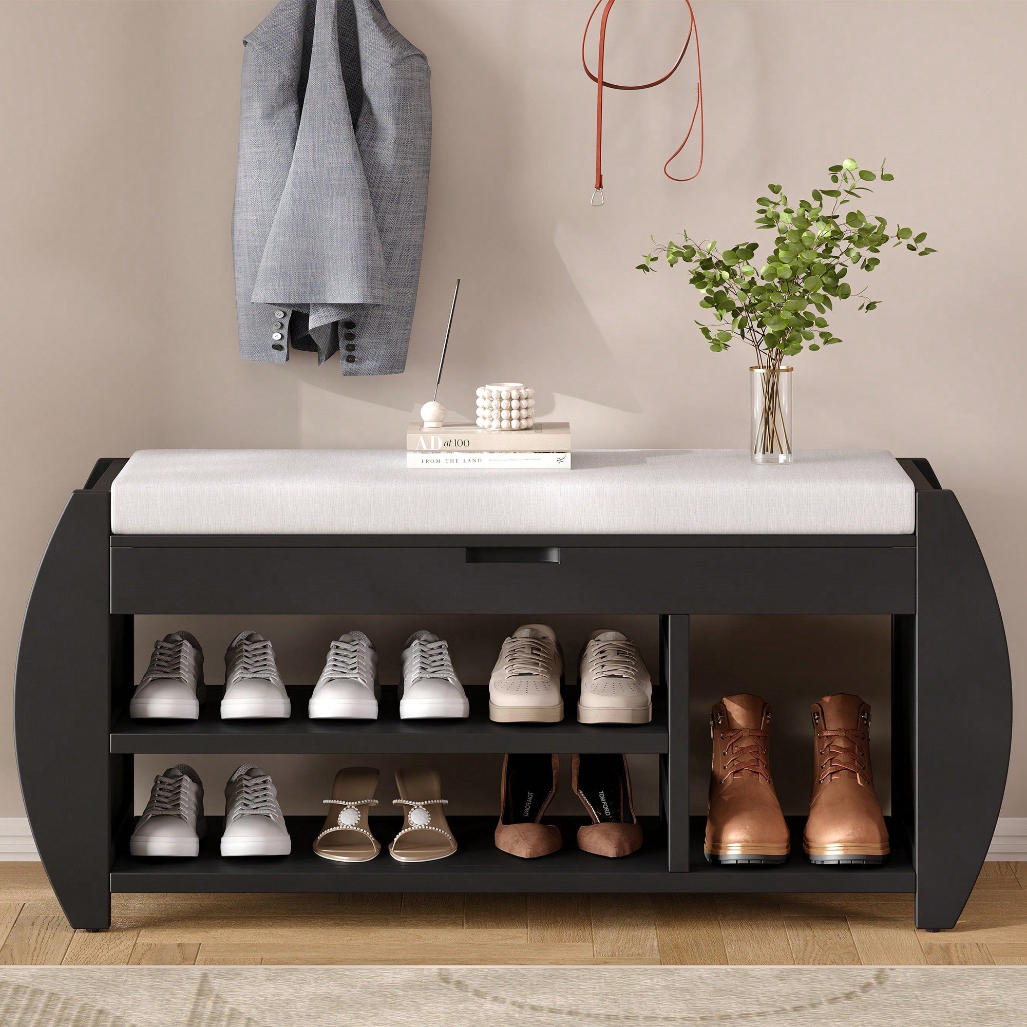 Multifunctional Storage Bench With Cushion And Curved Sides For Entryway And Living Room In Black