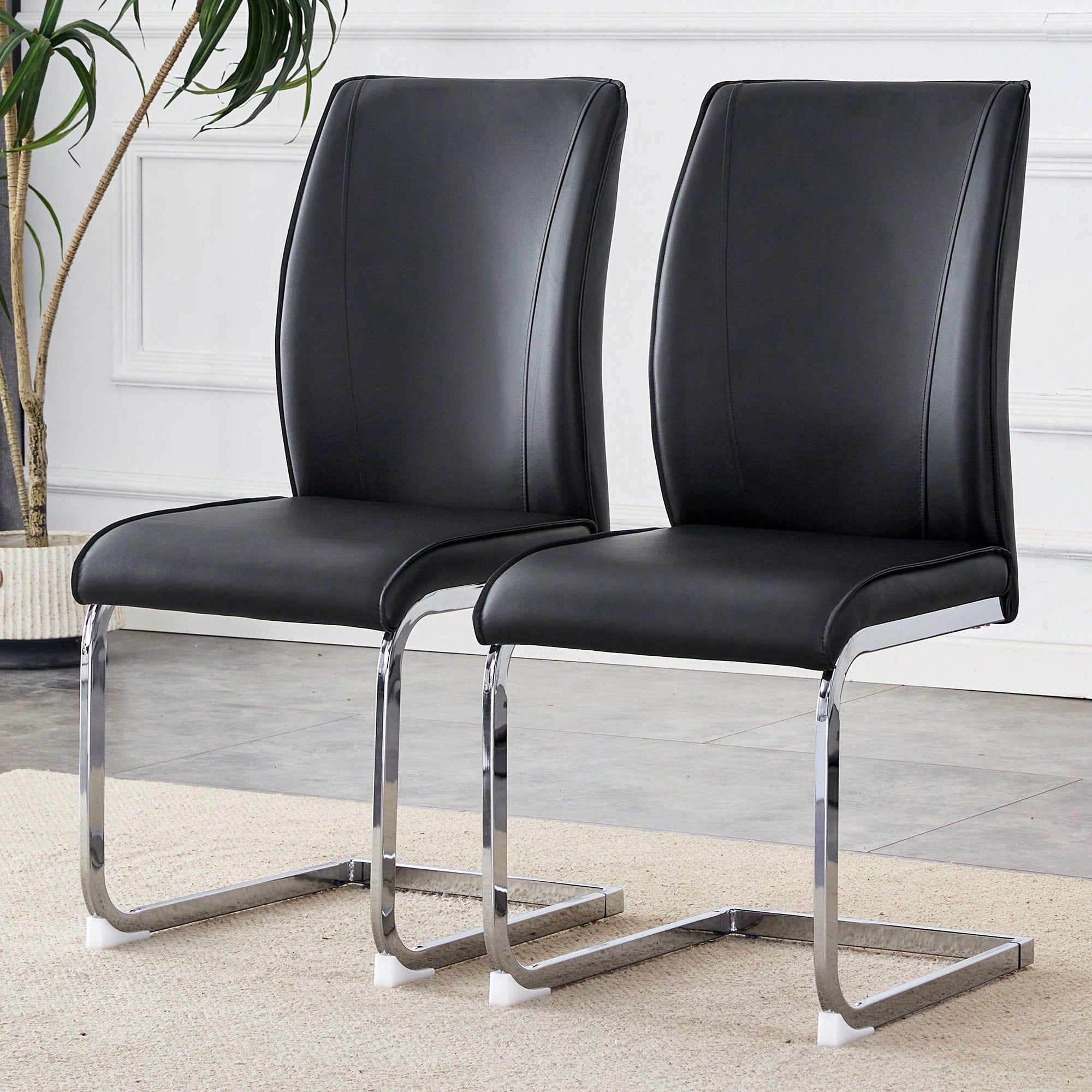 Elegant Black PU Dining Chairs With High Resilience And Arched Silver Metal Legs - Set Of 2