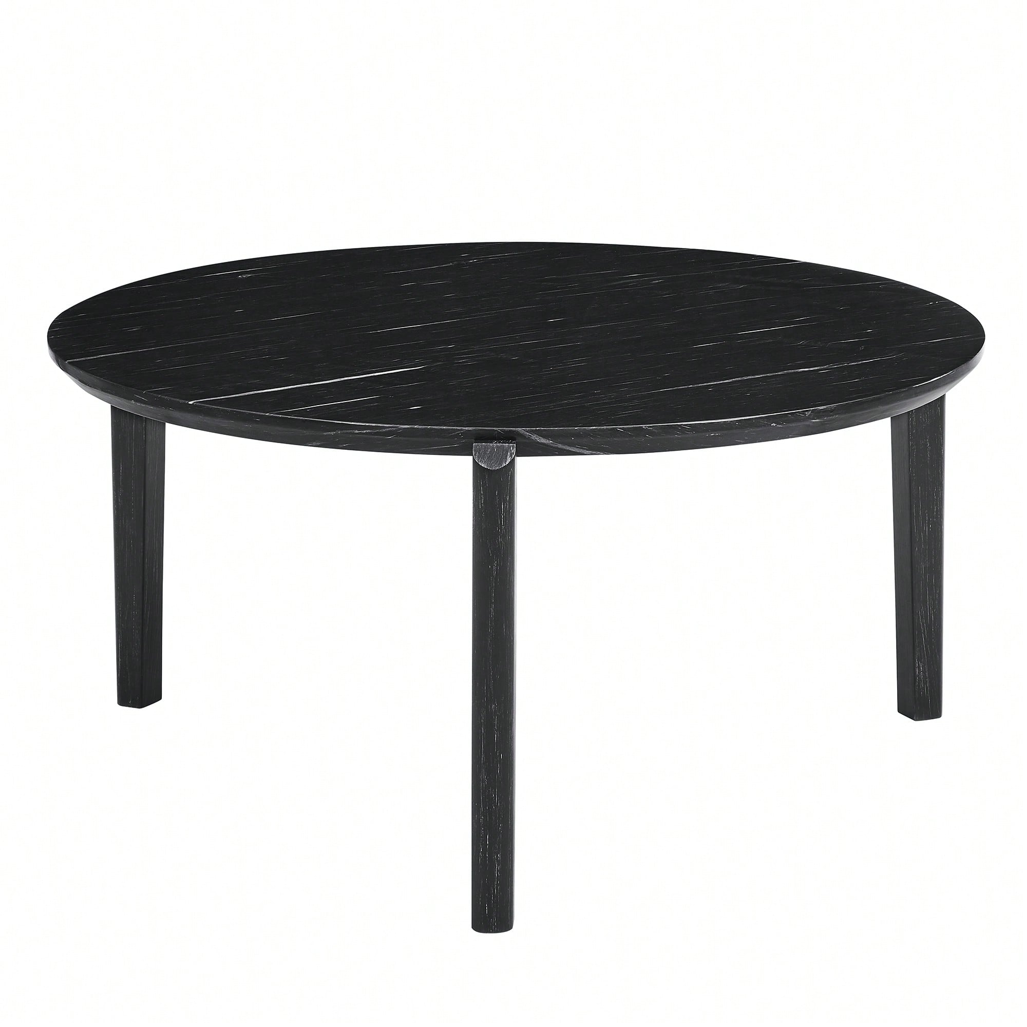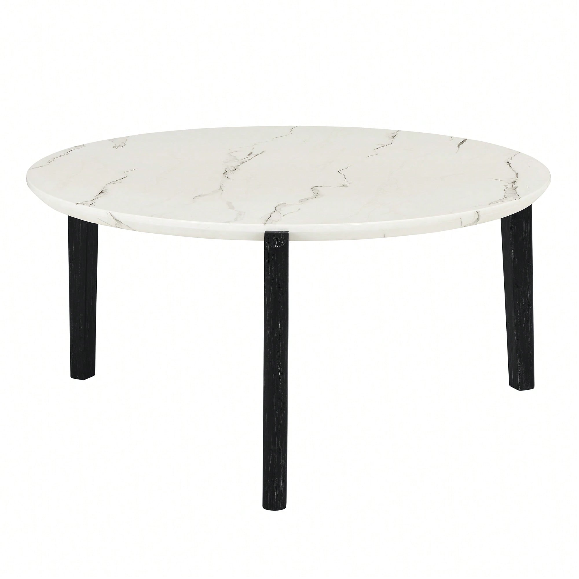Modern 36 Inch Round Coffee Table With Imitation Marble Top And Solid Rubber Wood Legs For Living Room And Office