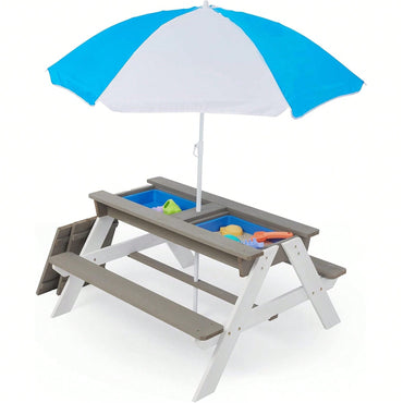 Outdoor Wooden Picnic Table With Umbrella For Kids - Sand And Water Activity Table For Backyard Play