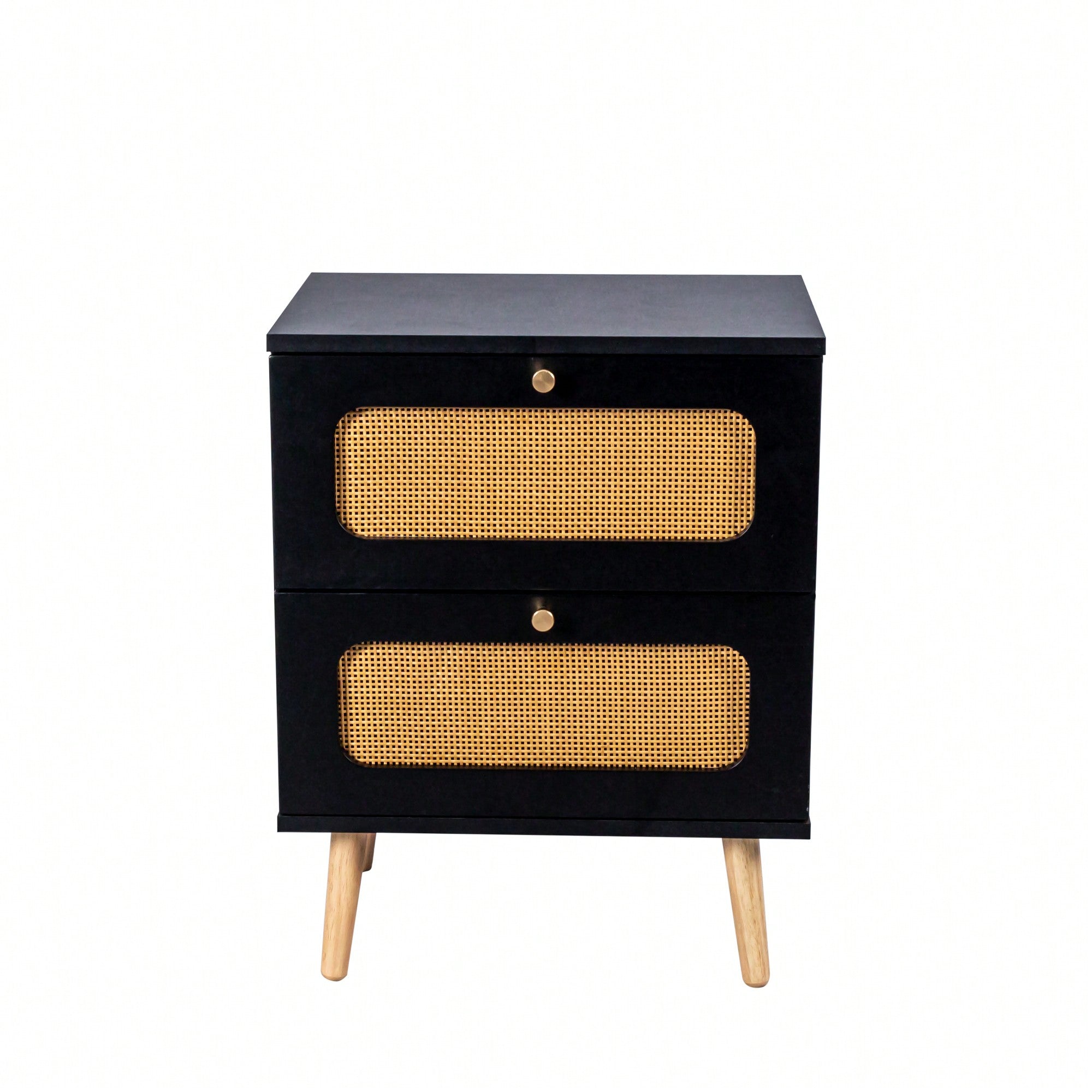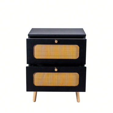 Handcrafted Rattan 2-Drawer Nightstand For Bedroom And Living Room, Stylish End Table With Decorative Storage Drawers
