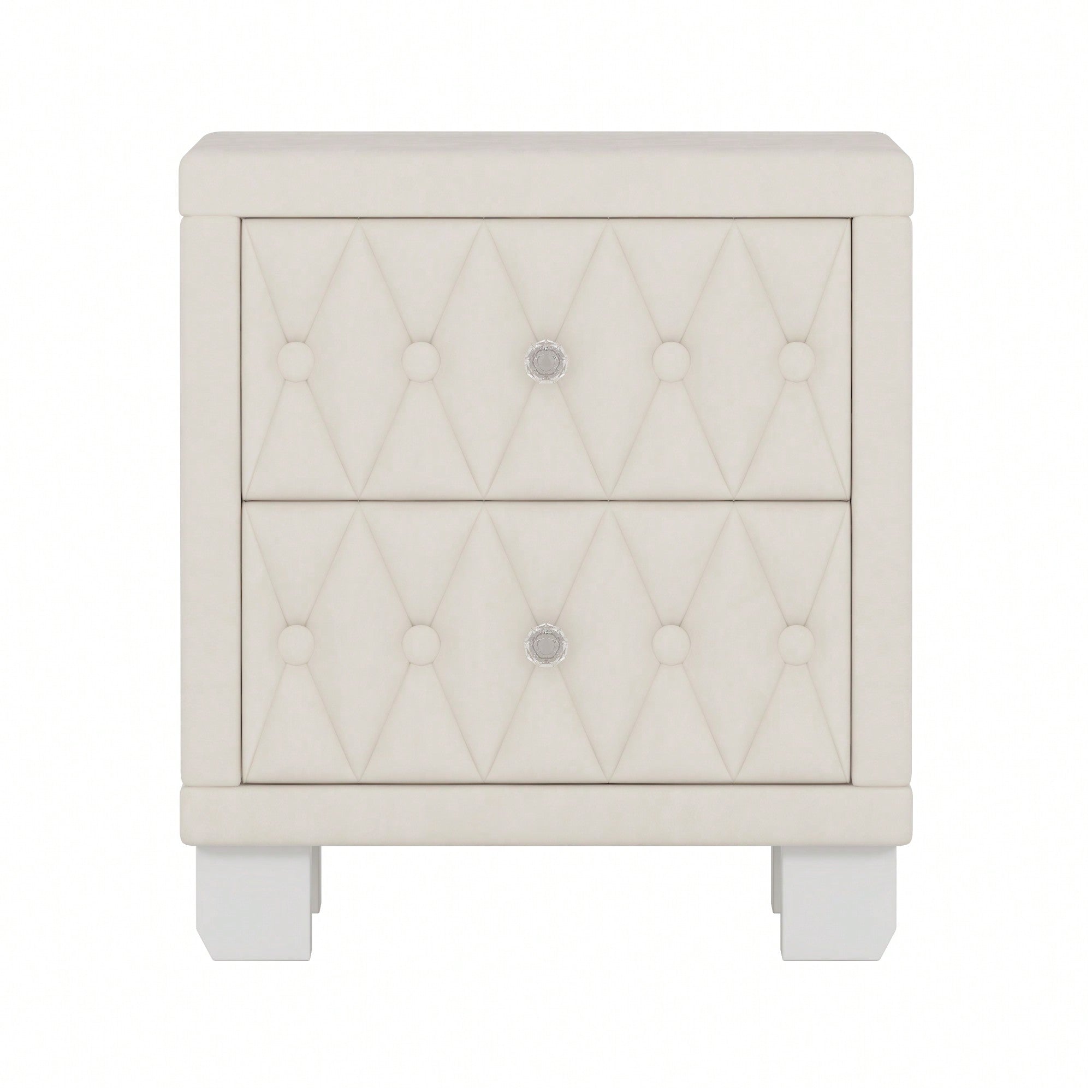 Elegant Velvet Nightstand With 2 Drawers And Crystal Handle Stylish Beige Bedside Table With Button-Tufted Design