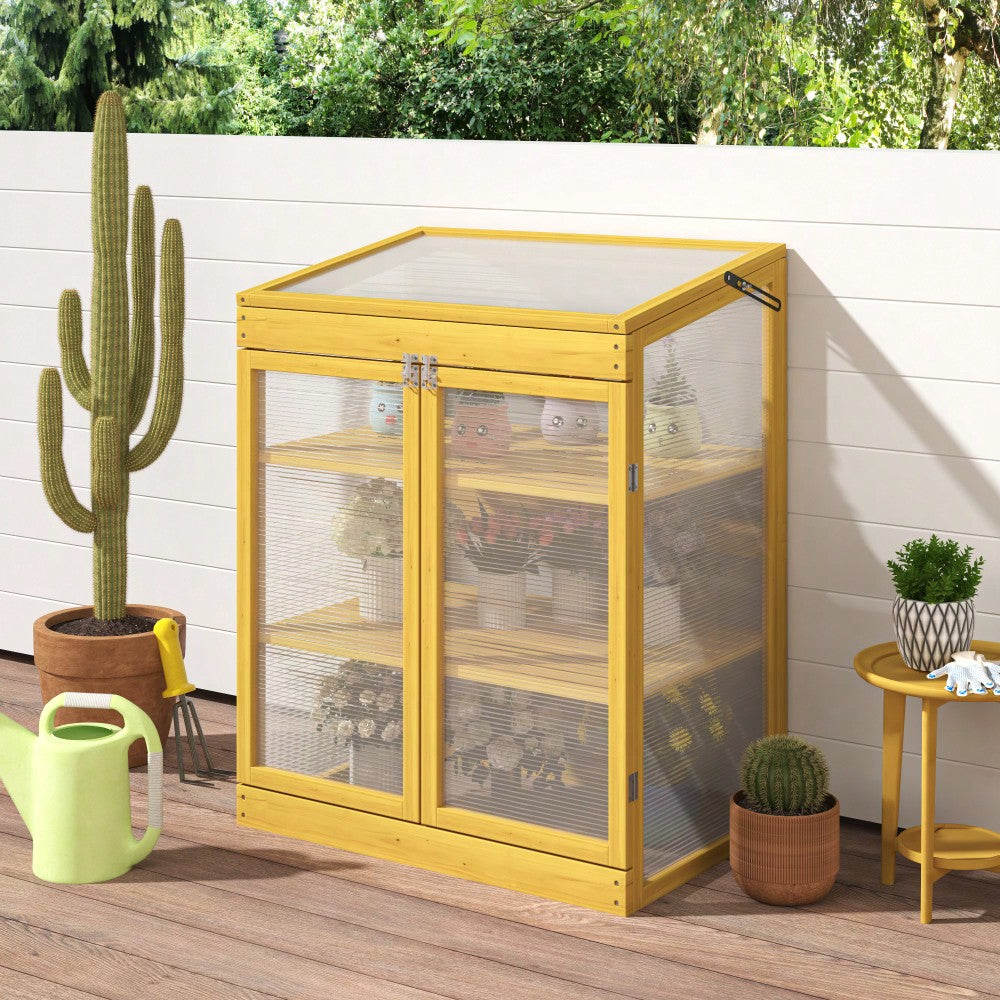Wooden Cold Frame Mini Greenhouse For Outdoor Use With 2-Tier Polycarbonate Shelves To Keep Plants Warm