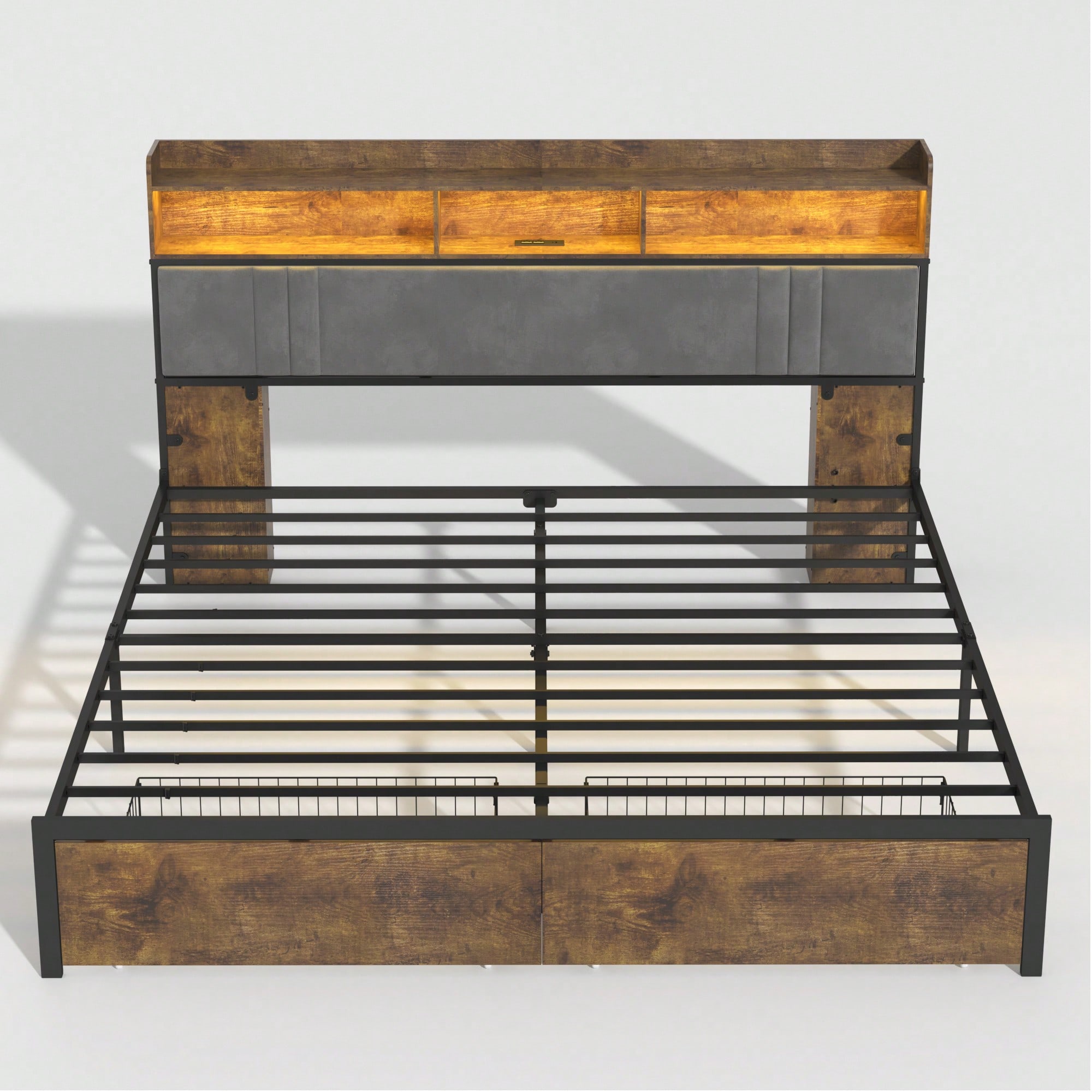 King Size Upholstered Bed Frame With Storage Headboard And Drawers, Charging Station And LED Light, Heavy Duty Noise-Free, Dark Brown