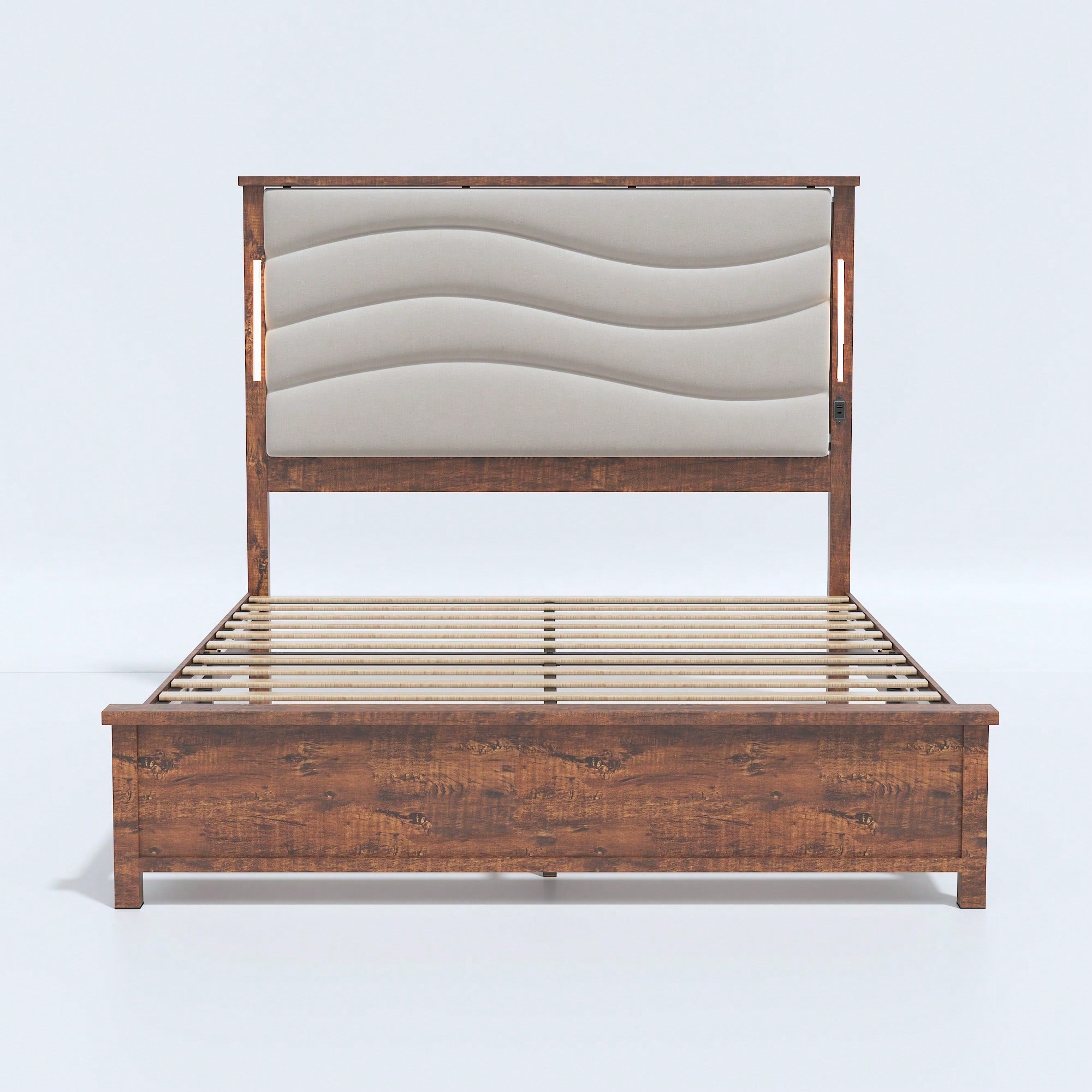 King Size Upholstered Metal Bed Frame With Wireless Charging USB Ports Touch LED Light And Under-Bed Storage Vintage Brown