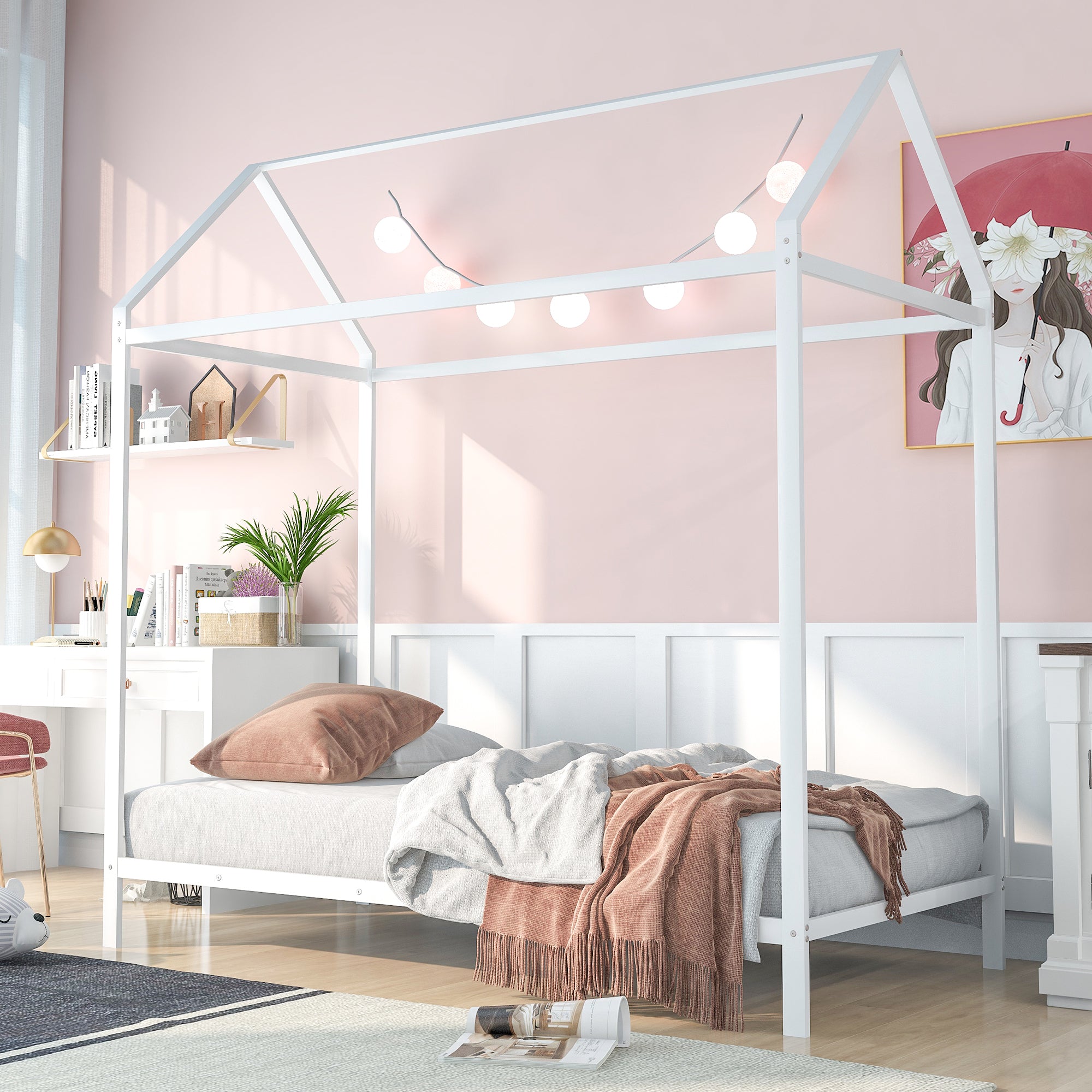 Kids Twin Size House Bed Frame - Metal Platform Floor Bed for Boys & Girls, No Box Spring Needed, White Finish