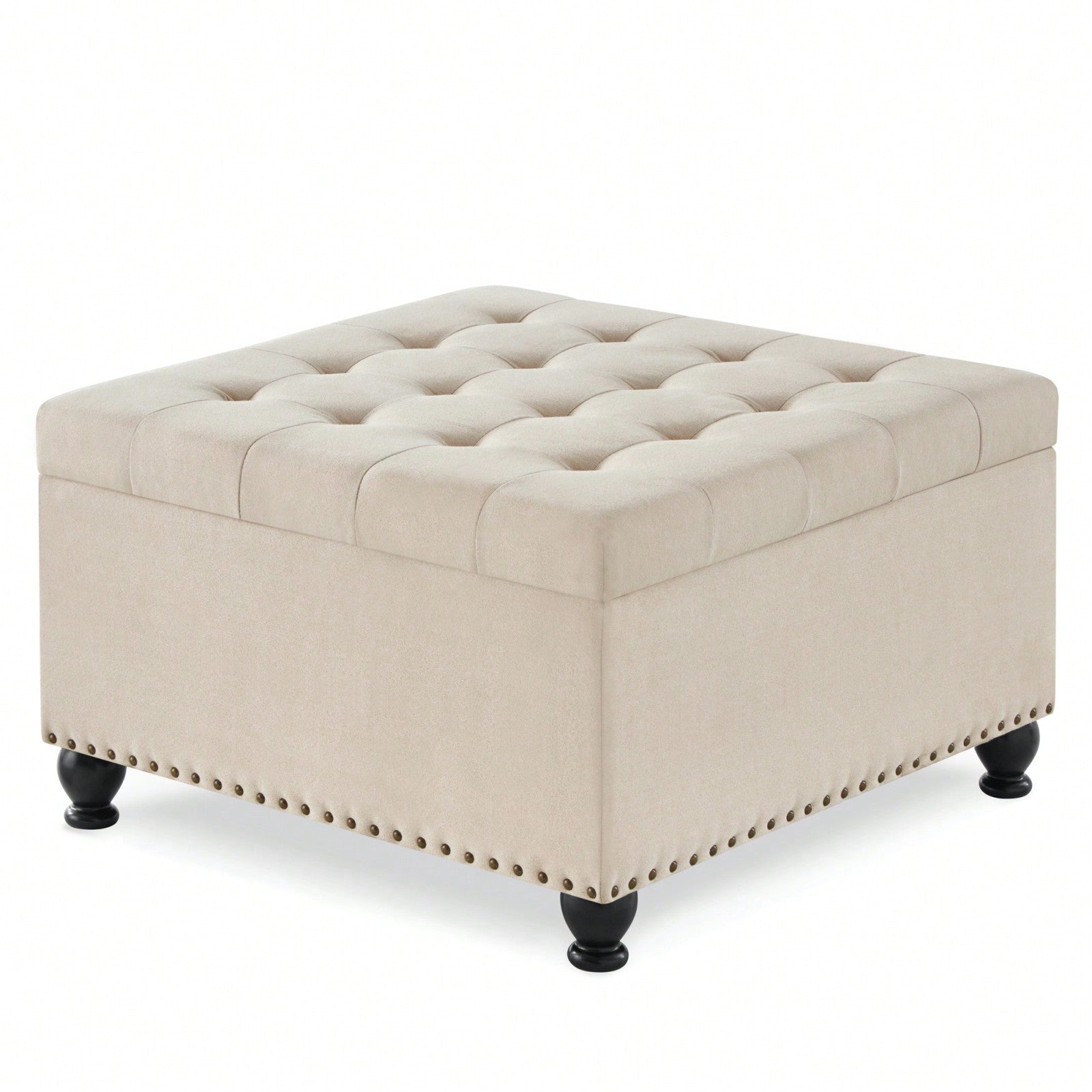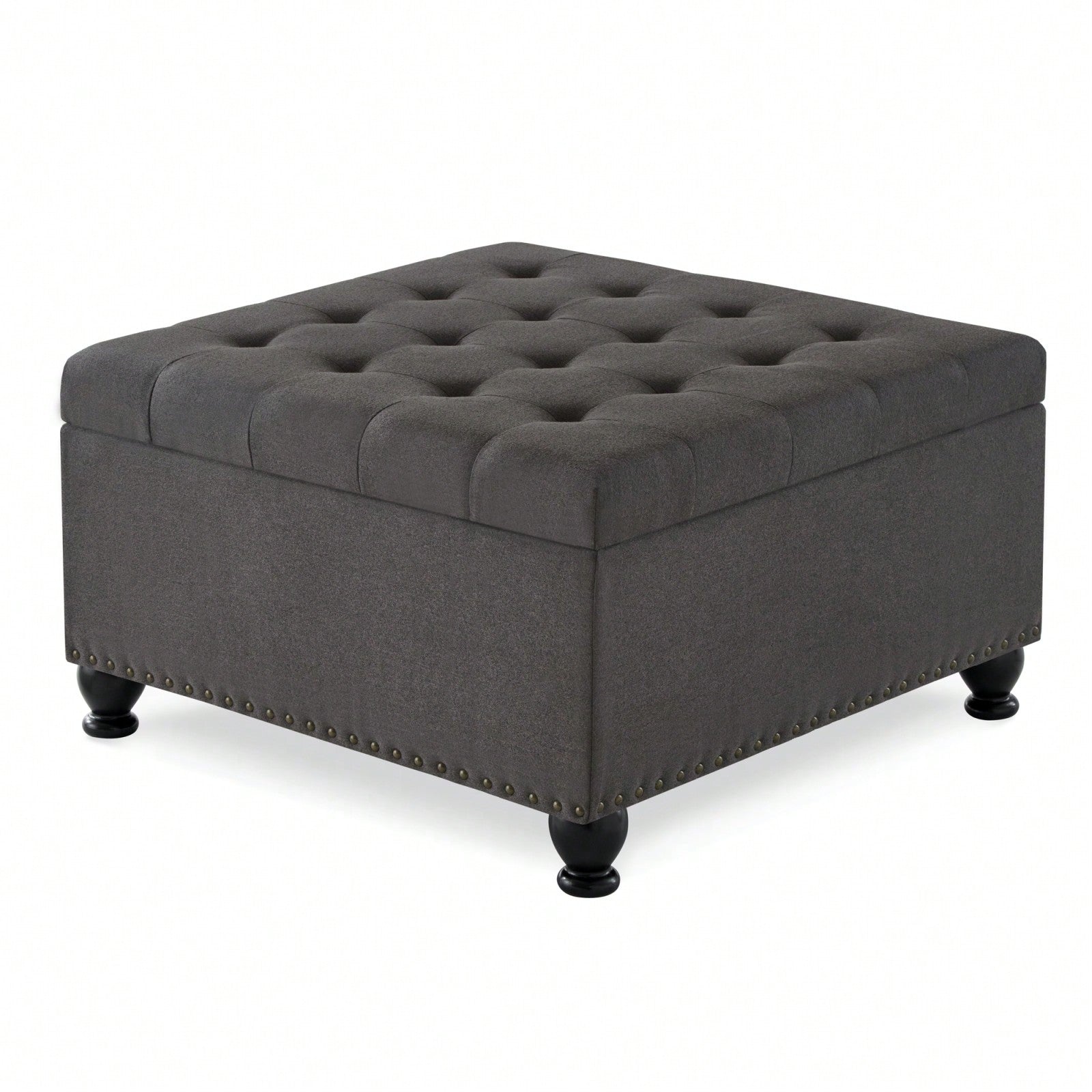 Large Storage Ottoman With Tufted Lid And Wooden Legs - Coffee Table Ottoman For Living Room, Bedroom