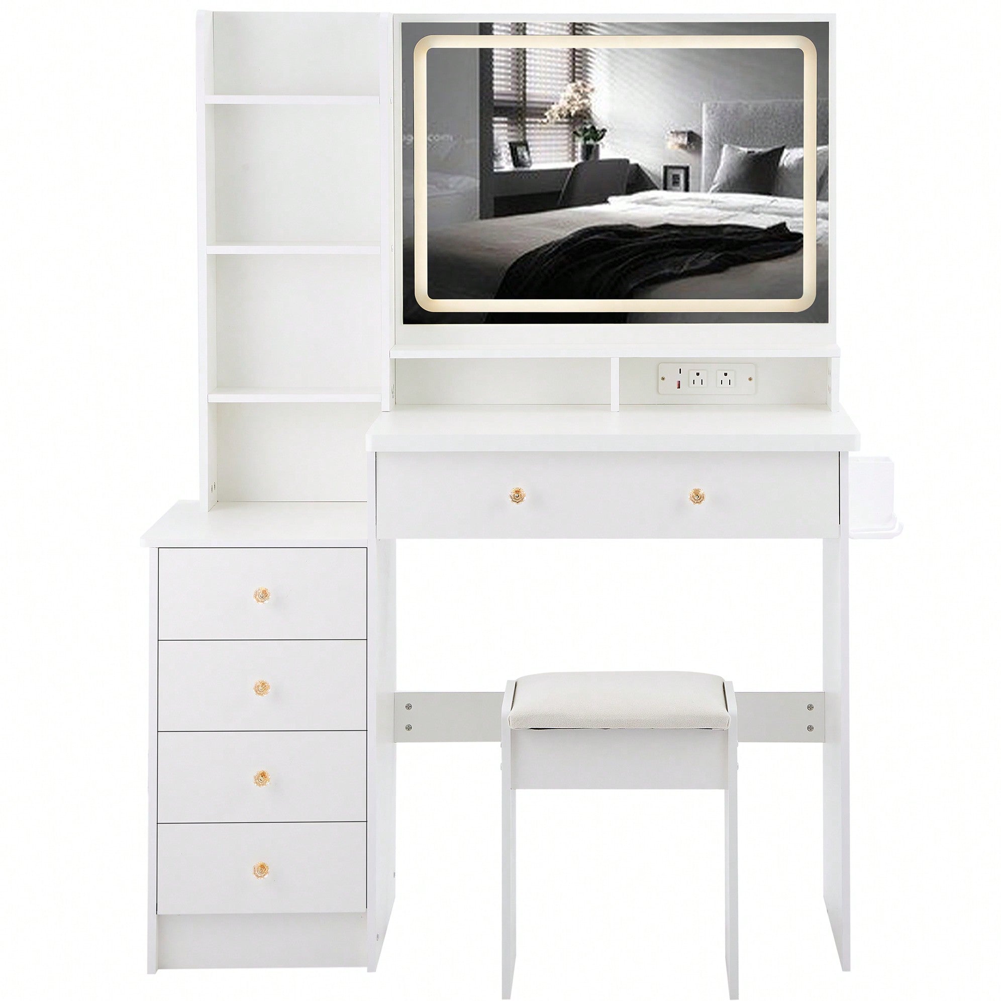 Large Vanity Table Set With Cushioned Stool, LED Mirror, Power Station, Hair Dryer Stand, 3-Color Switch